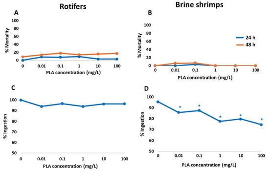 Results of the mortality (A,B) and ingestion (C,D) tests in rotifers and brine shrimps exposed to different concentrations of PLA NPs. Asterisks indicate significant differences compared to the control.