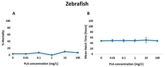 Effect of different concentrations of PLA NPs on zebrafish embryo development: (A) mortality rate at 120 h and (B) mean and standard deviation of hatching time of zebrafish larvae.