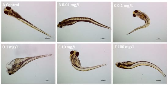 Representative micrographs of zebrafish embryos exposed to PLA NPs for 120 h. (A) control embryo showing normal development; (B) embryo exposed to 0.01 mg/L PLA NPs showing tail curvature. (C) embryo exposed to 0.1 mg/L PLA NPs showing spinal deformity; (D) embryo exposed to 1 mg/L PLA NPs showing pericardial and yolk sac oedema; (E) embryo exposed to 10 mg/L PLA NPs showing pericardial, yolk sac oedema and spinal deformity; (F) embryo exposed to 100 mg/L PLA NPs showing tail curvature. Scale bars: 100 µm.