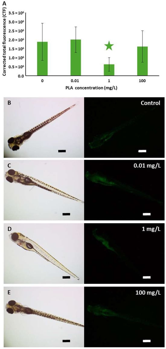 Quantification of the fluorescence signal from acridine orange staining indicating the presence of apoptotic cells revealed no significant differences between control and exposed organisms, except for those treated with 1 mg/L, which showed a significantly weaker signal than the others (Figure 7). Thus, exposure to PLA NPs did not increase cell death in zebrafish embryos.