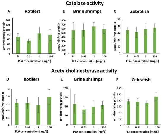 Biomarker responses in rotifers, brine shrimps and zebrafish embryos exposed to different concentrations of PLA NPs. (A–C) Catalase activity (µmol/min/mg prot). (D–F) Acetylcholinesterase activity (nmol/min/mg prot). Vertical segments show standard deviations.