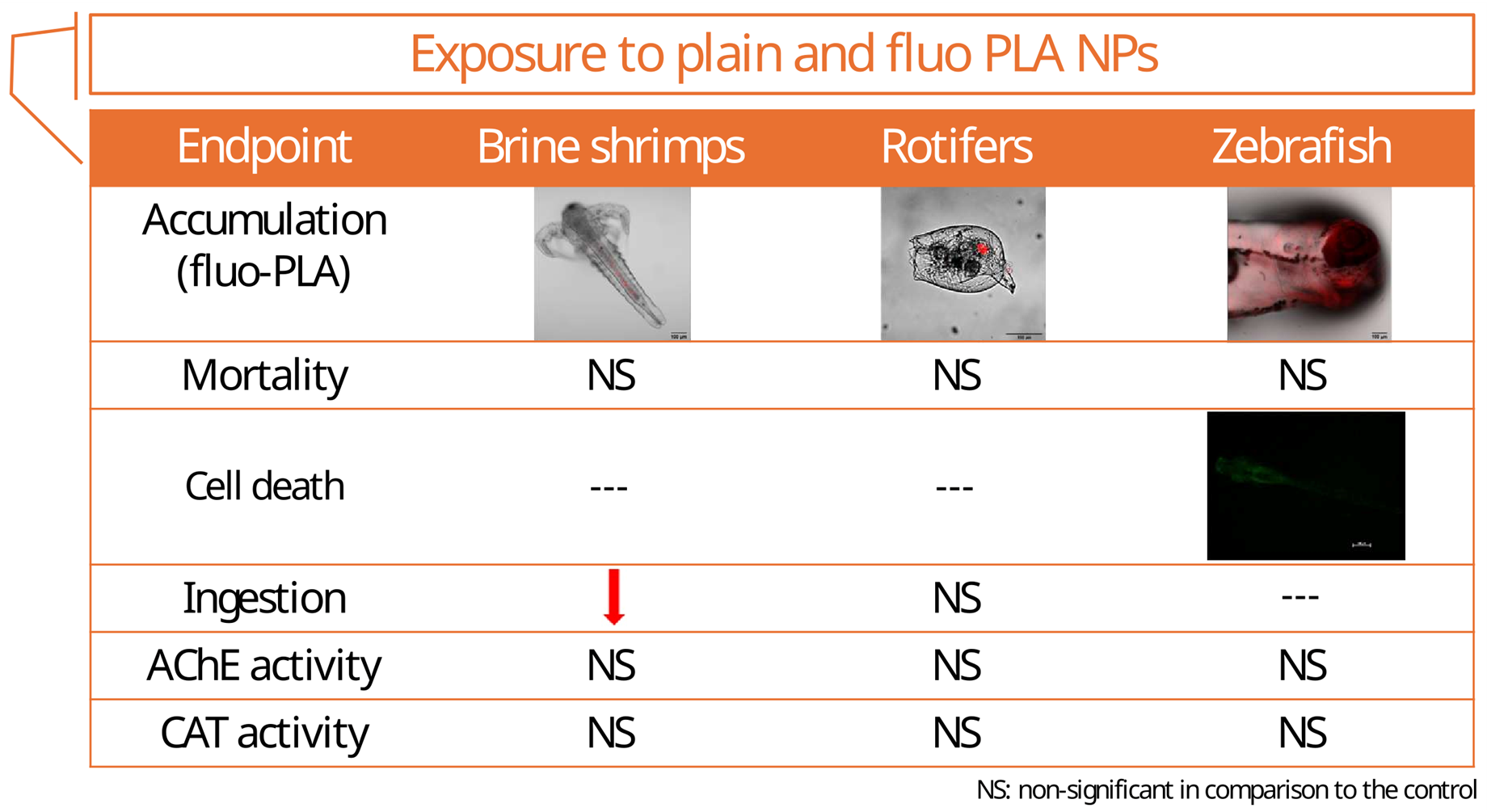 Addressing the fate of NPs is a challenging issue due to the lack of analytical tools to detect them in exposed organisms and the difficulty of linking potential adverse effects with NP accumulation. In the present study, we took the advantage of the existence of fluorescent and plain PLA NPs of the same characteristics and we combined the use of confocal microscopy for the detection of fluorescent PLA NPs in the investigated organisms with a battery of bioassays and biochemical biomarkers to study the toxicological response in two aquatic invertebrates (rotifer and brine shrimp) and in a model vertebrate species (zebrafish embryos), representing marine and freshwater habitats and different trophic levels. Zooplankton is a primary consumer in the aquatic food chain, serving as energy links to higher trophic organisms, while zebrafish embryos offer insights into potential vertebrate developmental impacts. We hypothesised that PLA NPs would be uptaken by the organisms and could elicit both acute and sublethal responses in the test species.