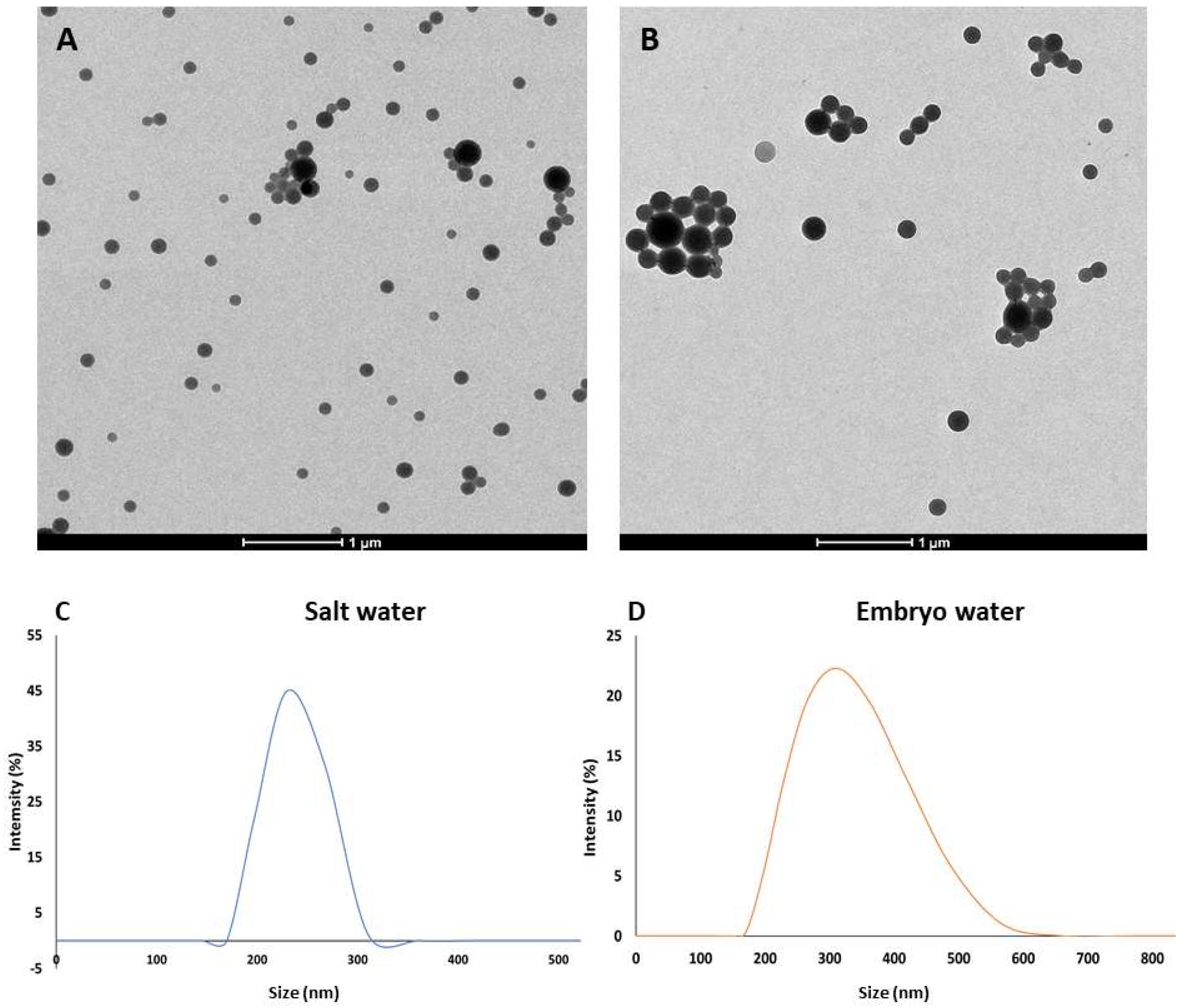 Figure 1. Transmission electron micrographs of plain (A) and fluorescent PLA NPs (B). Hydrodynamic size of the plain PLA NPs at a concentration of 100 mg/L in salt water (C) and in embryo water (D).