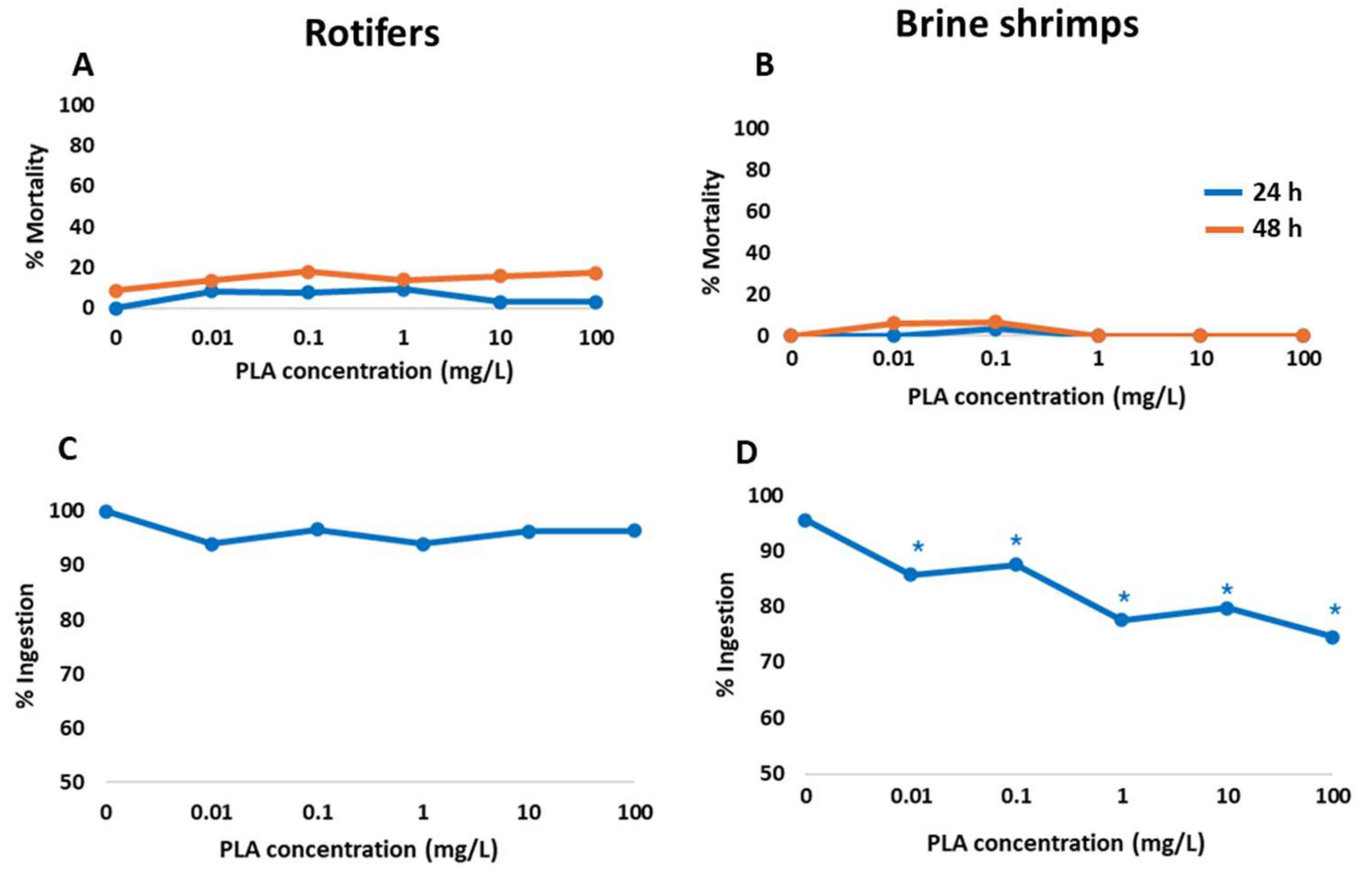 Figure 4. Results of the mortality (A,B) and ingestion (C,D) tests in rotifers and brine shrimps exposed to different concentrations of PLA NPs. Asterisks indicate significant differences compared to the control.