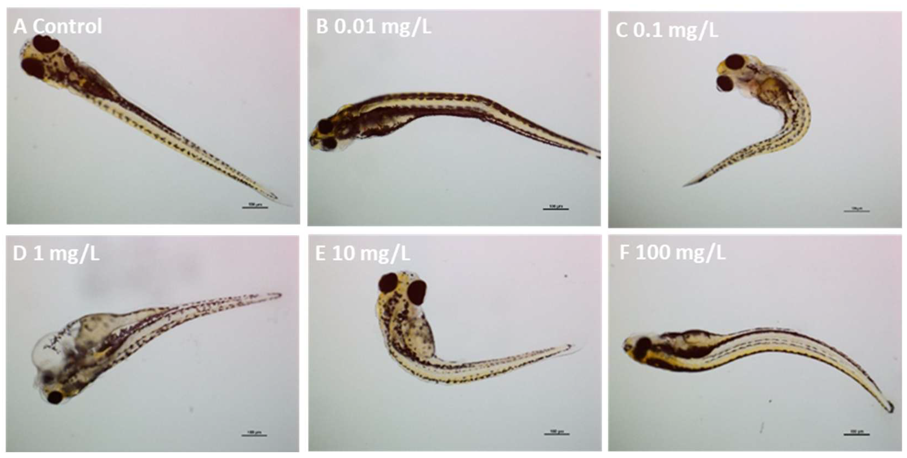 Figure 6. Representative micrographs of zebrafish embryos exposed to PLA NPs for 120 h. (A) control embryo showing normal development; (B) embryo exposed to 0.01 mg/L PLA NPs showing tail curvature. (C) embryo exposed to 0.1 mg/L PLA NPs showing spinal deformity; (D) embryo exposed to 1 mg/L PLA NPs showing pericardial and yolk sac oedema; (E) embryo exposed to 10 mg/L PLA NPs showing pericardial, yolk sac oedema and spinal deformity; (F) embryo exposed to 100 mg/L PLA NPs showing tail curvature. Scale bars: 100 µm.