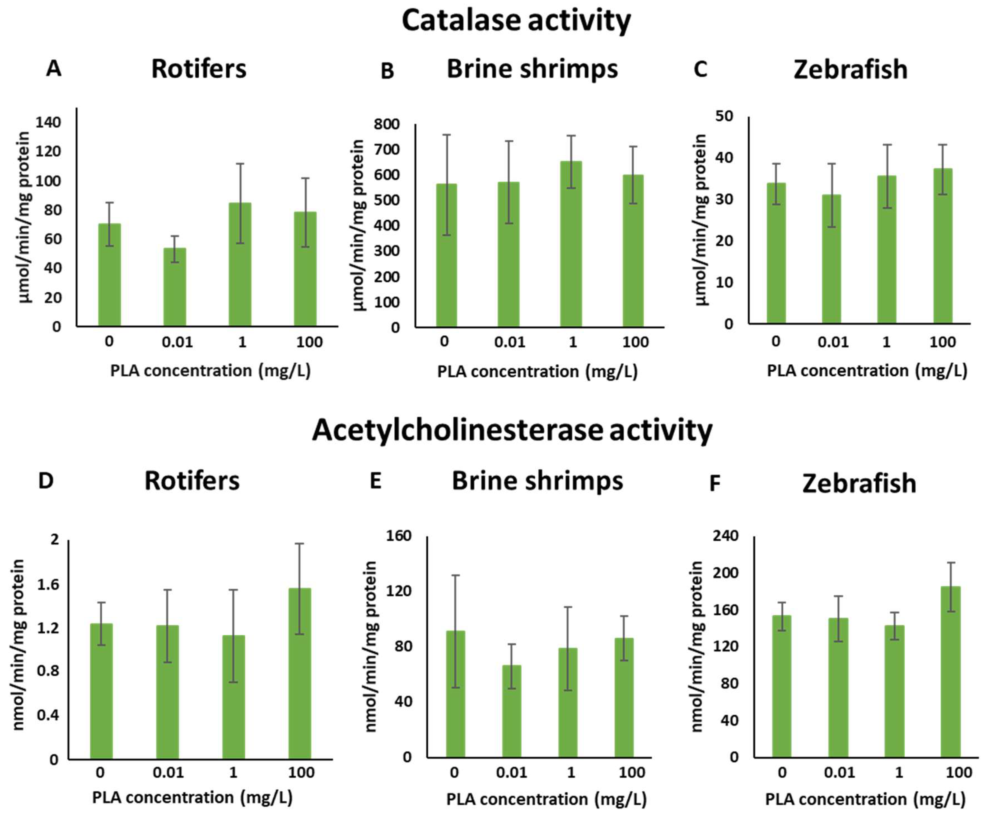 Figure 8. Biomarker responses in rotifers, brine shrimps and zebrafish embryos exposed to different concentrations of PLA NPs. (AC) Catalase activity (µmol/min/mg prot). (DF) Acetylcholinesterase activity (nmol/min/mg prot). Vertical segments show standard deviations.