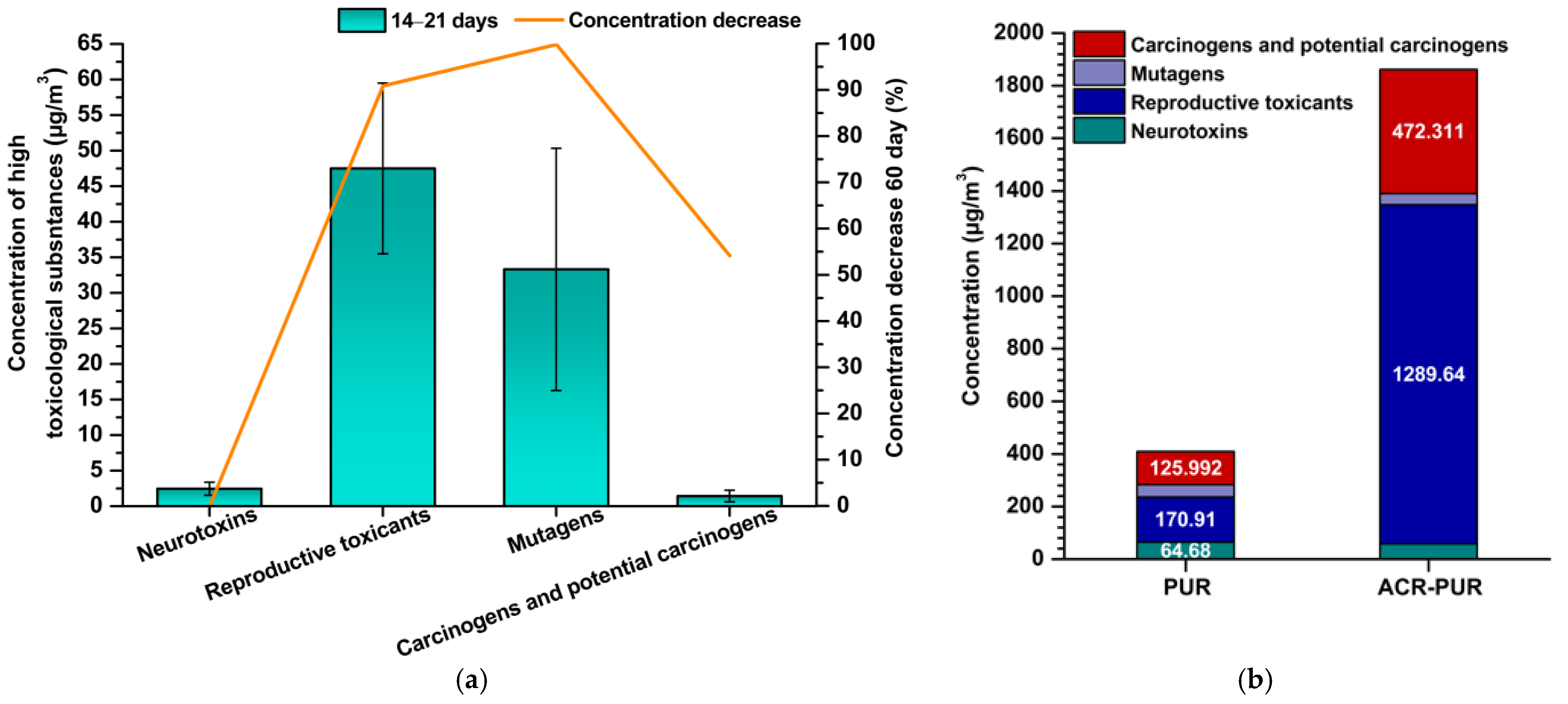 | Reproductive toxicants | Toluene, styrene, phthalates | Acrylate–polyurethane (toluene, styrene), Polyurethane (phthalates) |