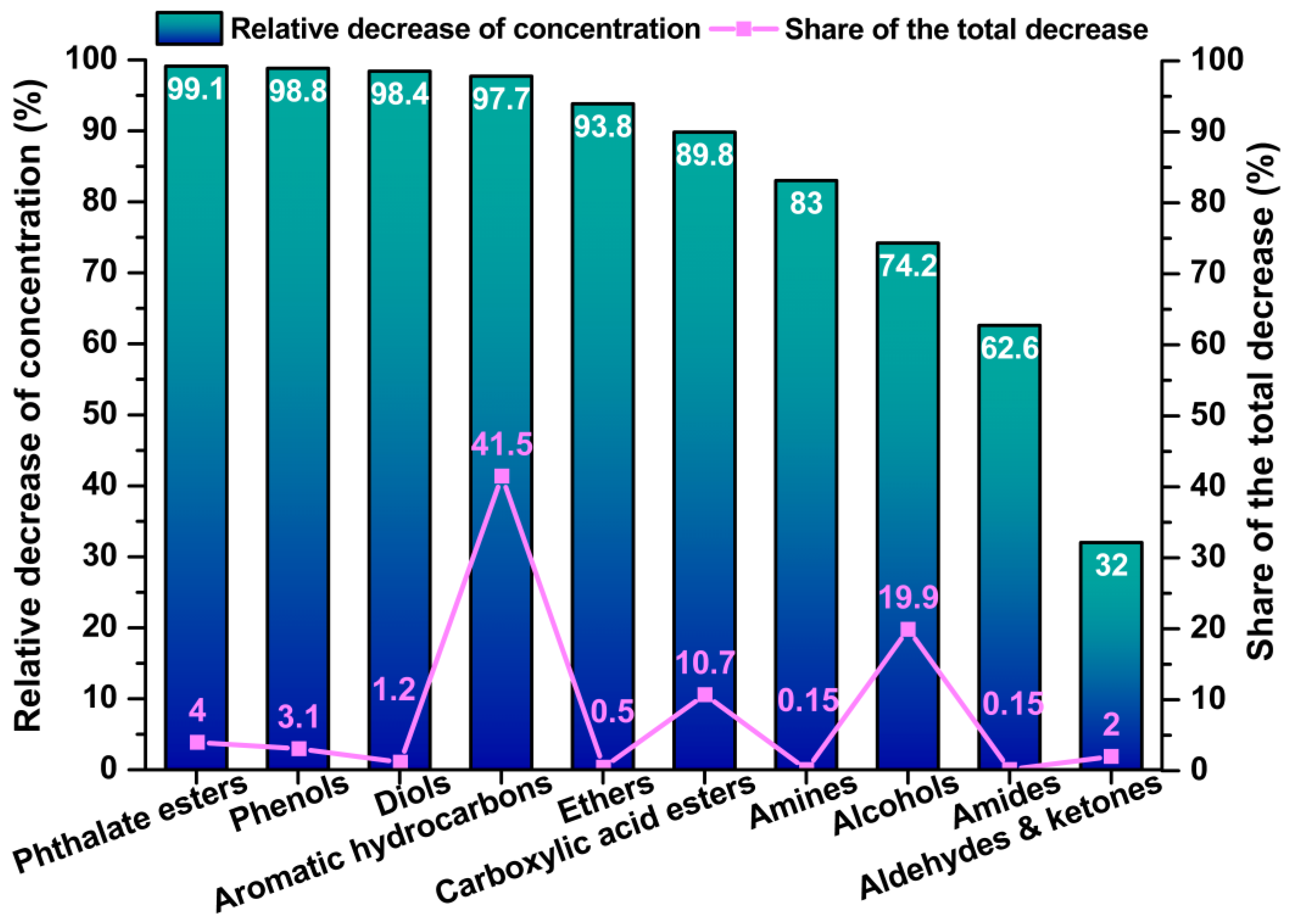 | Mutagens | Benzene, phenol | Near-complete reduction |