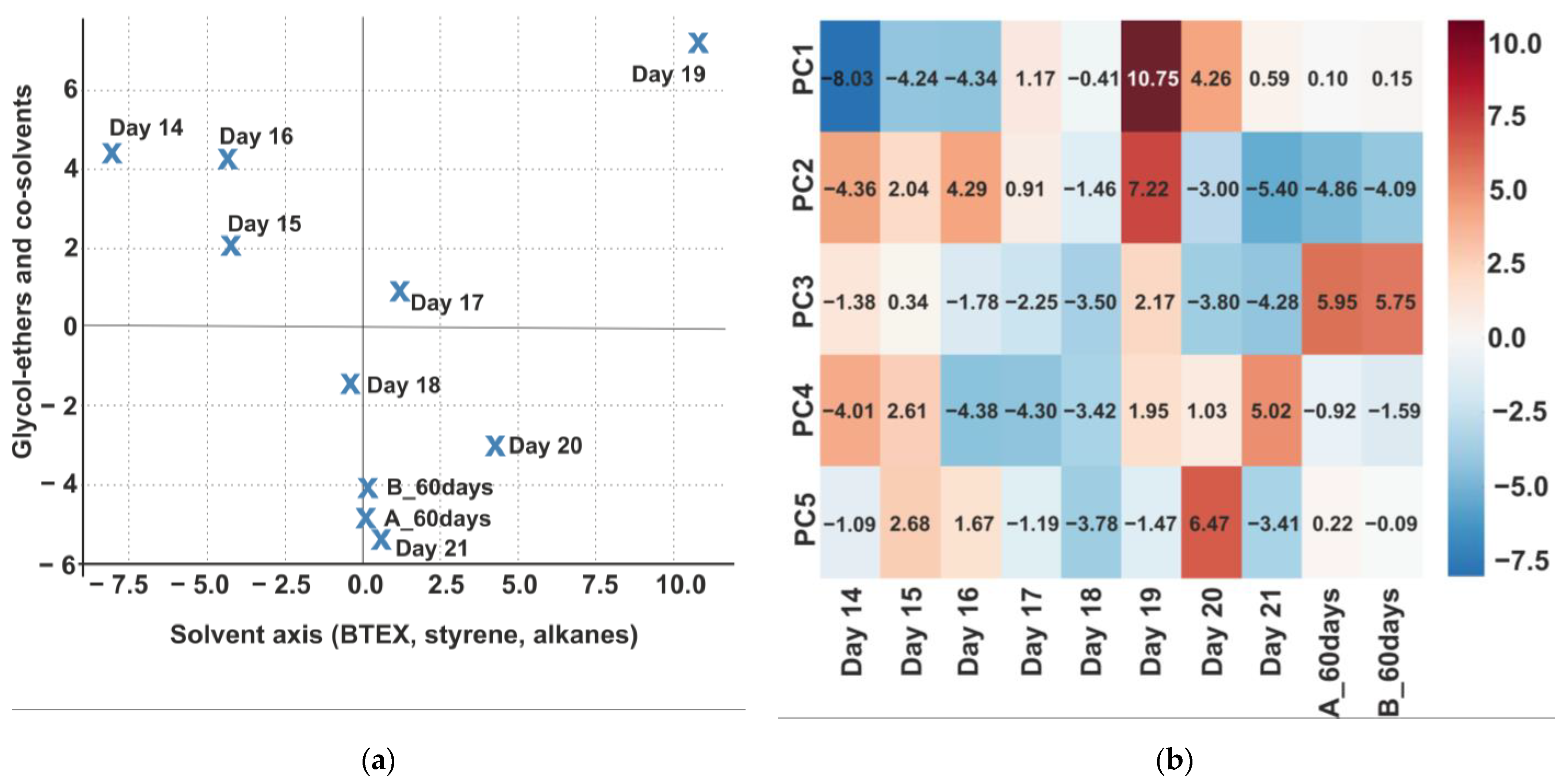 | PC1 Solvent fraction | Octanal (−0.396), Hexanal (0.393), 2-butoxyethoxyethanol (0.389), Styrene (−0.379), 2-butoxyethanol (0.372), o-xylene (−0.364), Nonanal (0.351), 1,2,4-trimethylbenzene (−0.342), 1-methoxypropan-2-ol (0.335), Benzaldehyde (0.328) |