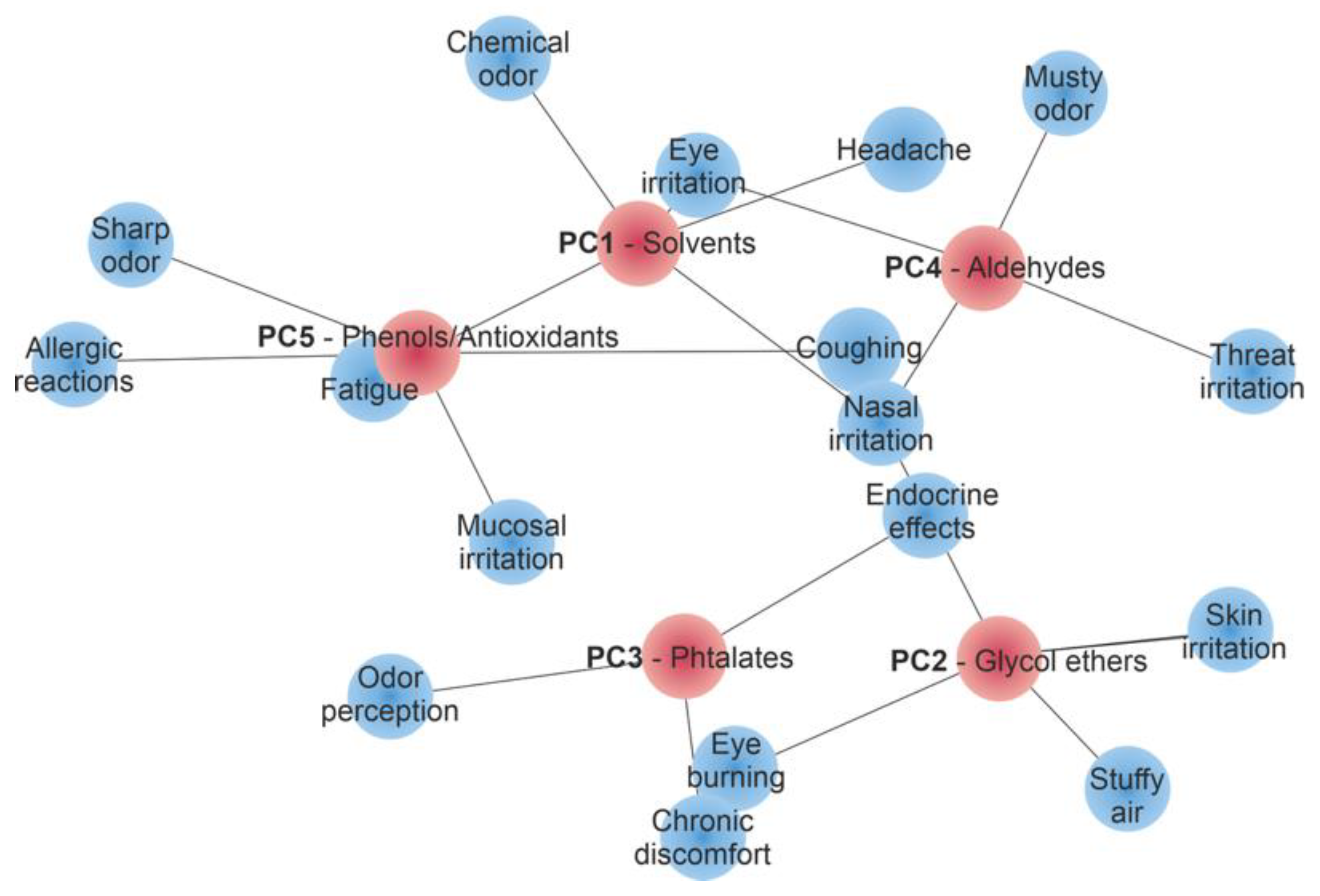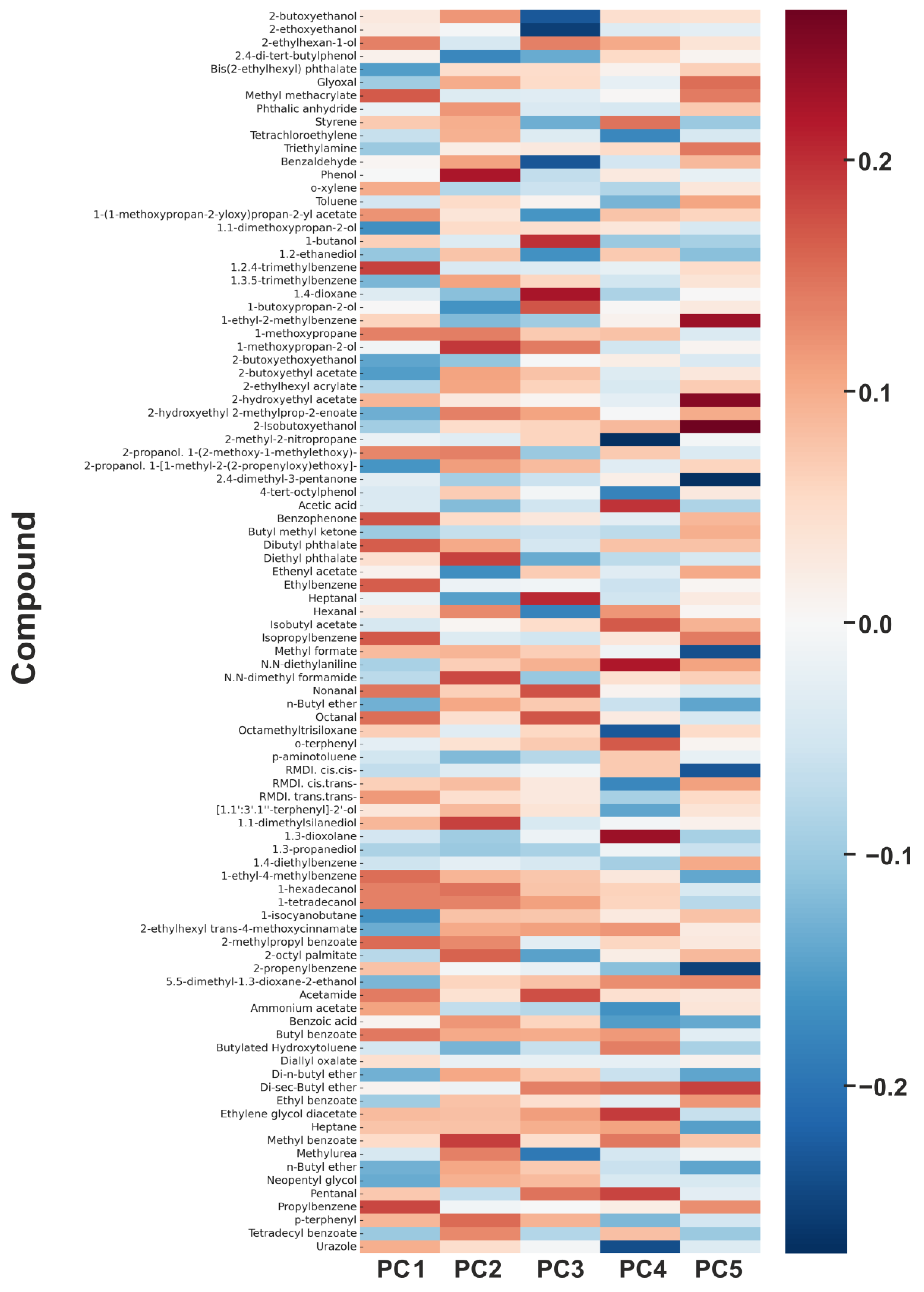 | PC2 Glycol ethers and their esters | 1-methoxypropan-2-ol (0.402), Heptane (0.401), o-xylene (0.397), Styrene (0.383), 2-butoxyethanol (−0.372), Hexanal (−0.361), Phenol (0.348), 2,4-di-tert-butylphenol (0.342), Nonanal (−0.334), 1,2,4-trimethylbenzene (0.329) |