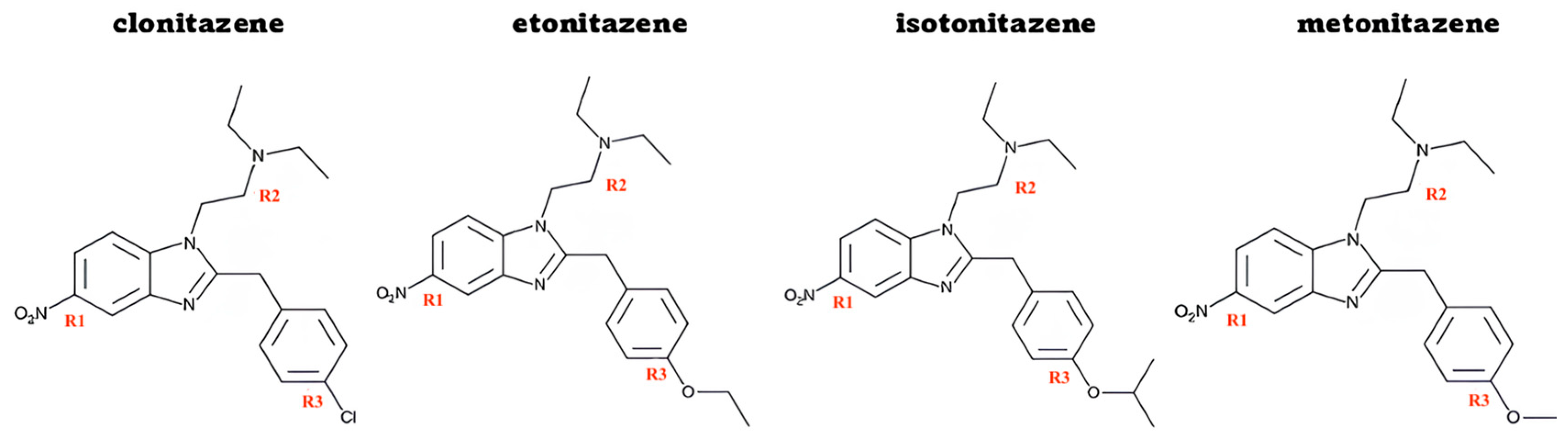 - Ujváry, I.; Christie, R.; Evans-Brown, M.; Gallegos, A.; Jorge, R.; De Morais, J.; Sedefov, R. DARK Classics in Chemical Neuroscience: Etonitazene and Related Benzimidazoles. ACS Chem. Neurosci. 2021, 12, 1072–1092. [Google Scholar] [CrossRef] [PubMed]