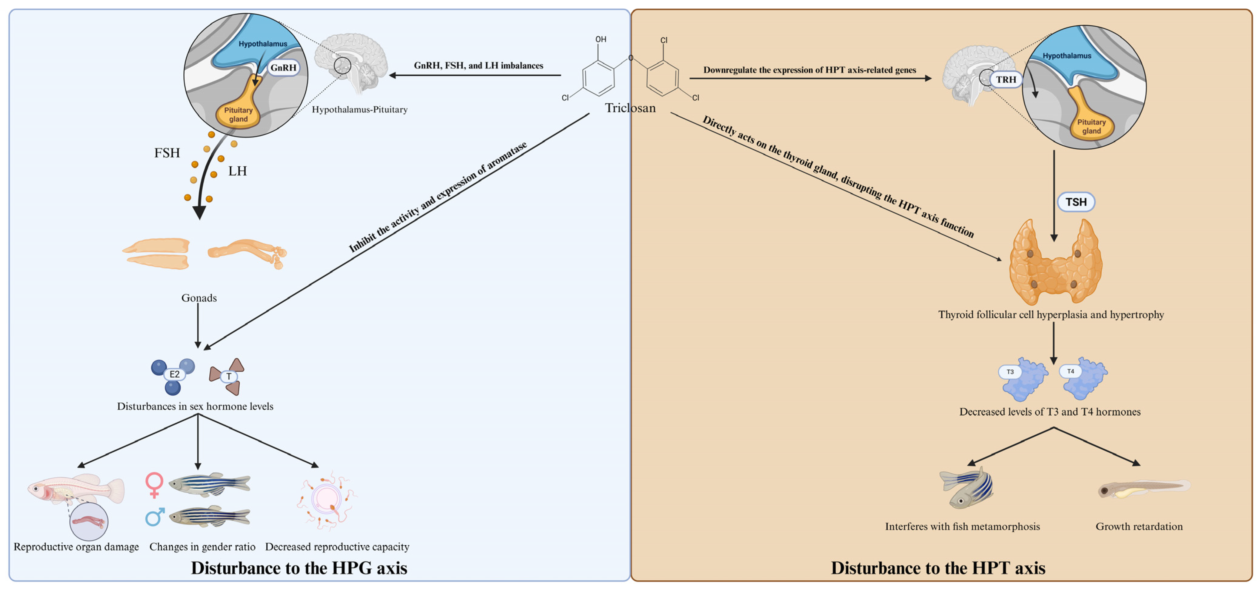 - Tang, N.; Fan, P.; Chen, L.; Yu, X.; Wang, W.; Wang, W.; Ouyang, F. The effect of early life exposure to triclosan on thyroid follicles and hormone levels in zebrafish. Front. Endocrinol. 2022, 13, 850231. [Google Scholar] [CrossRef]