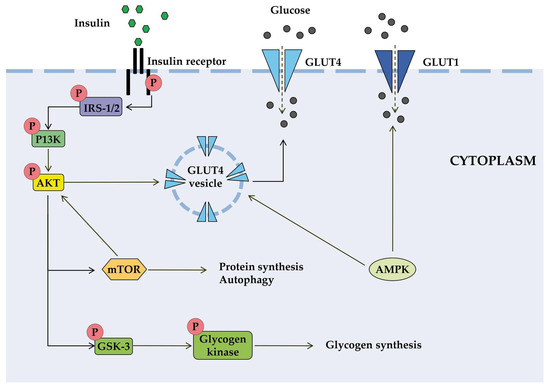 There are two main categories of glucose transporters present in humans. Sodium-dependent glucose transporters (SGLTs) mediate active sodium transport across the membrane, which then diffuses along its concentration gradient together with a glucose molecule. Sodium-independent glucose transporters (GLUTs) mediate passive glucose transport across the plasma membrane [38]. GLUT1, the main glucose transporter, is present throughout all tissues of the body [39]. GLUT2 is expressed mainly in pancreatic β-cells, the liver, and the kidneys [40]. GLUT3 is present predominantly in the brain [32,40]. GLUT4 is found in the heart, skeletal muscles, adipose tissue, and the brain [40]. Among these, only GLUT4 expression is regulated by insulin [36,37]. Virtually all mammalian cells have insulin receptors (IRs), although the main tissues affected by insulin are muscle, adipose tissue, nervous tissue, and the liver [41]. The IR is a member of the receptor tyrosine kinase subfamily. It is a tetrameric protein consisting of two α- and two β-subunits. [42,43].