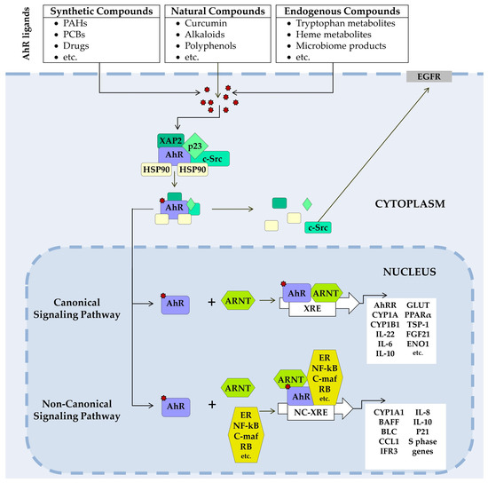 Traditionally, AhR has been recognized as a biological sensor of planar chemical AhR is generally considered to be a factor activated by chemical compounds with a planar structure of both exogenous and endogenous origin [60,61,62], which underlies its established role in xenobiotic metabolism, particularly environmental pollutants. For a long time, AhR attracted attention mainly from toxicologists studying its role in the metabolism of 2,3,7,8-tetrachlorodibenzodioxin (TCDD) and similar compounds, PAHs, and polychlorinated biphenyls (PCBs), resulting in hyperactivation of target gene transcription and release of toxic and carcinogenic compounds [63,64,65,66]. Subsequent research has demonstrated that AhR is activated not only by planar xenobiotics but also by numerous low-molecular-weight endogenous and exogenous compounds [67,68,69].