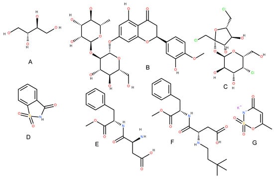 Erythritol (A), neohesperetine (B), sucralose (C), saccharin (D), aspartame (E), neotame (F), and acesulfame-K (G).