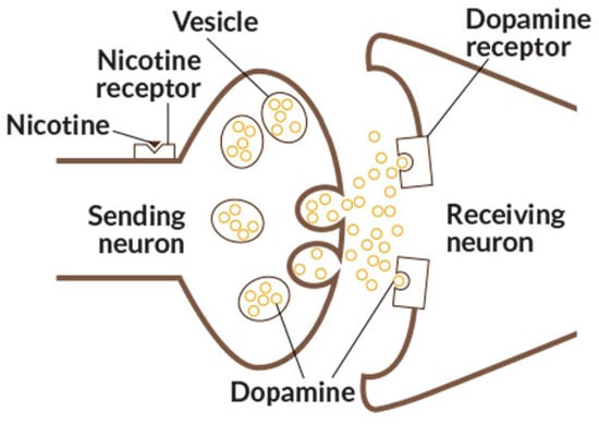 Moreover, unlike conventional cigarettes, which contain a relatively fixed mixture of tobacco-related compounds (which inclusively makes them more fool-proof than vapes), e-liquids are chemically diverse and often include non-typical substances absent from combustible tobacco [43,44,45]. Also, the proper nicotine derivatives and other N. tabacum and N. rustica alkaloids may be present in them in more water-soluble and, as a result, more biocompatible salt form, acting directly on brain nicotine receptors (Figure 2), provoking dopamine secretion and brain stimulation, leading an addicted user to continue smoking for hours.