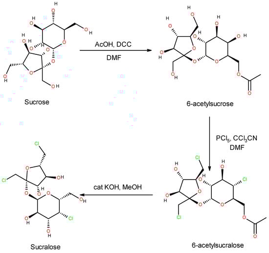 - The Synthesis of Sucralose from Sucrose. Available online: https://www.sciencesnail.com/science/the-synthesis-of-sucralose-from-sucrose (accessed on 11 September 2025).