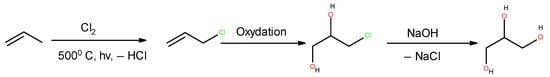 Glycerol classical synthesis from propylene. 3-chloropropane-1,2-diol is the oxidation product and glycerol precursor.