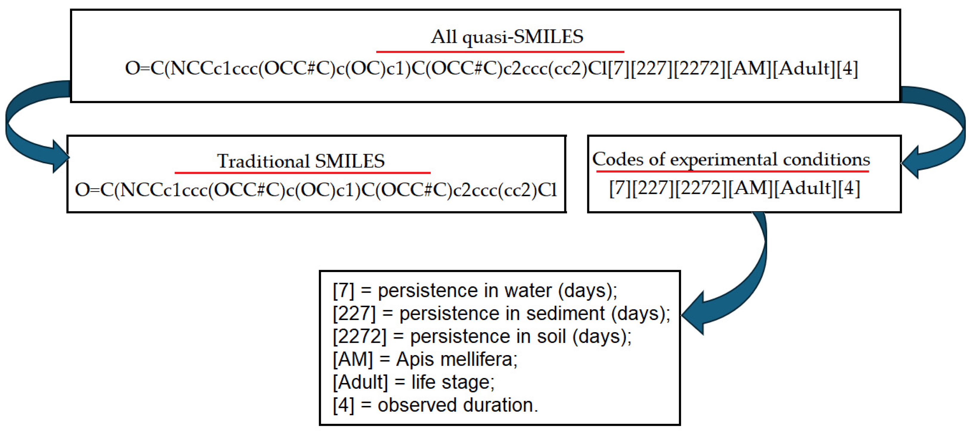 - Toropova, A.P.; Toropov, A.A. (Eds.) QSPR/QSAR analysis using SMILES and Quasi-SMILES. In Challenges and Advances in Computational Chemistry and Physics; Springer: Cham, Switzerland, 2023; Volume 33, pp. 241–268. [Google Scholar] [CrossRef]