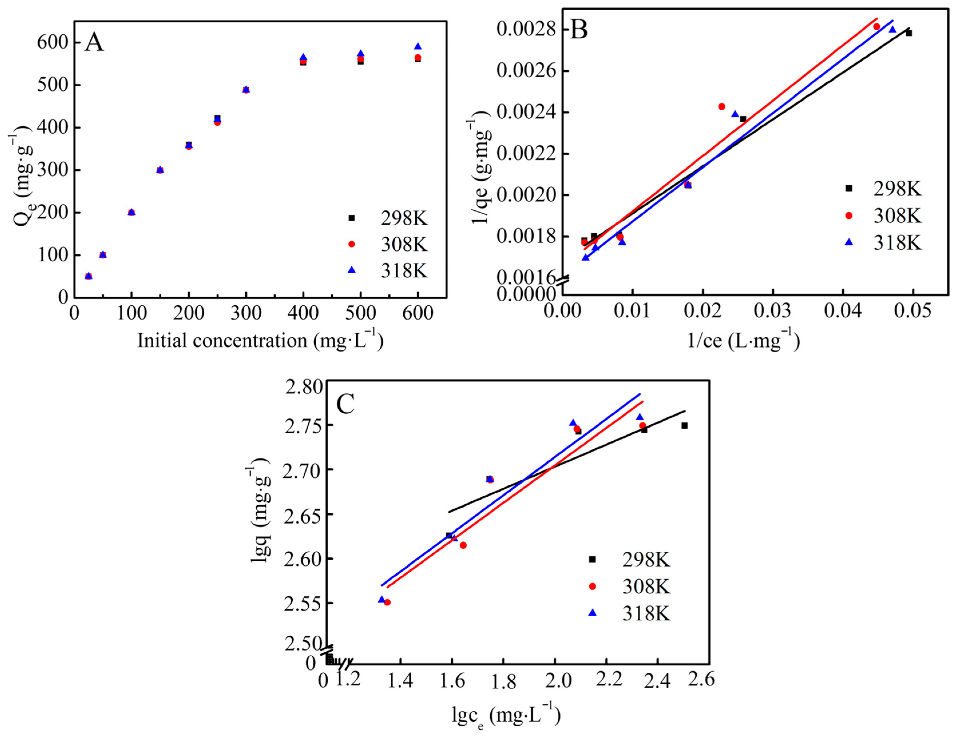 | T/K | qm (mg·g−1) | KL (L·mg−1) | R2 | KF (mg·g−1) | 1/n | R2 |