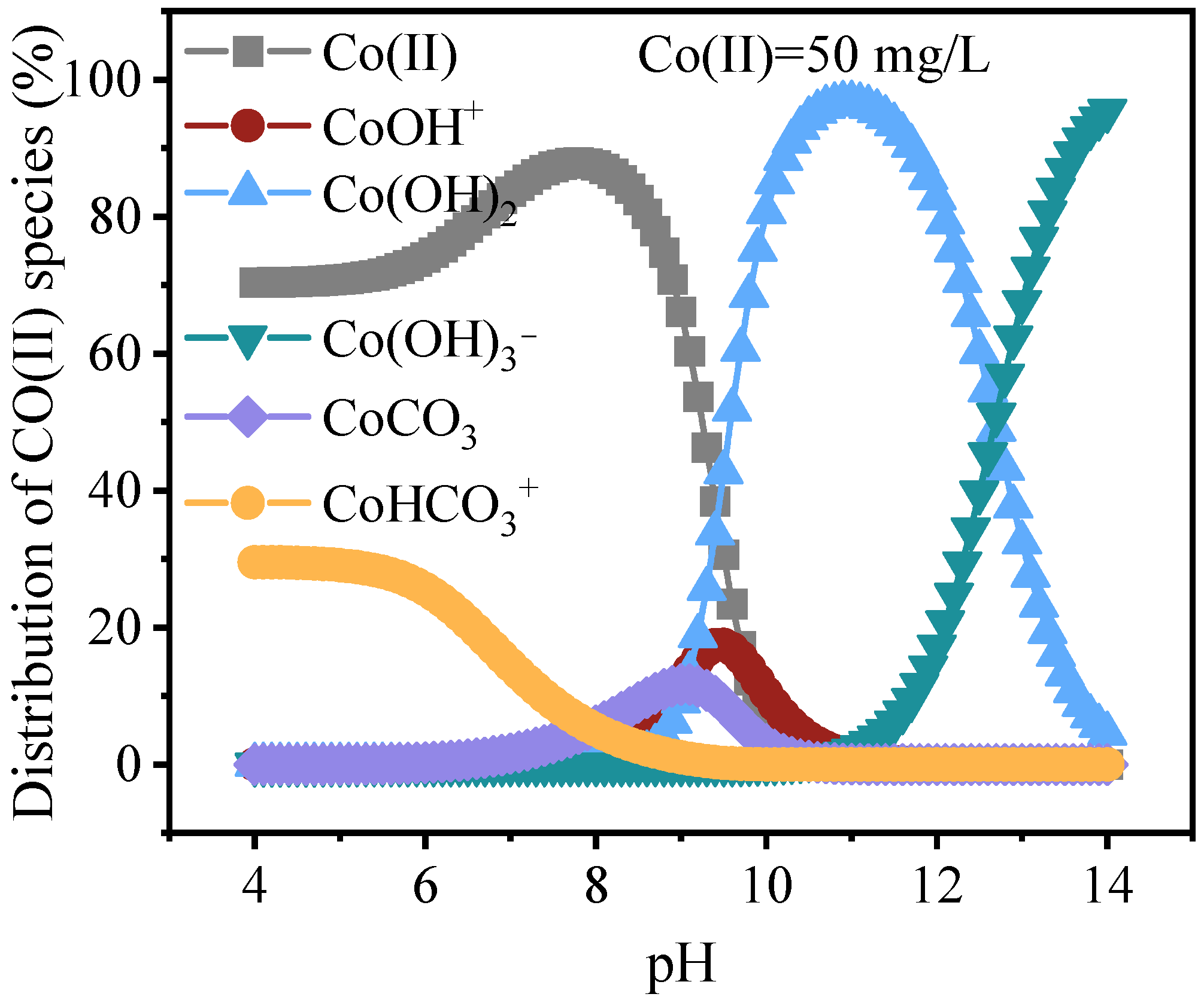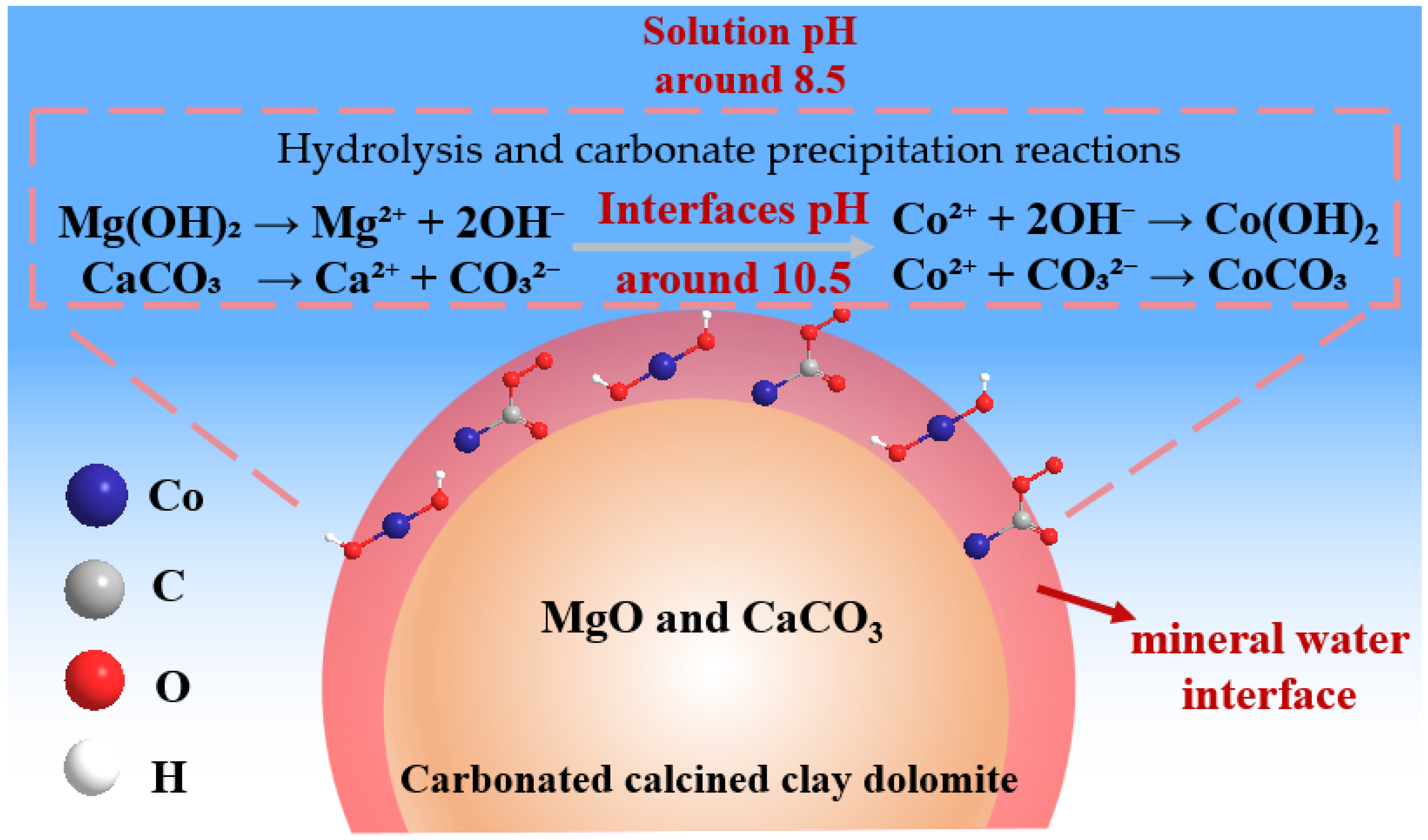 - Visual MINTEQ calculations and solid phase characterizations (XRD, XPS, TEM) indicate that Co(II) immobilization is dominated by mineral water interface precipitation rather than extensive bulk precipitation at the measured effluent pH. The microscale alkaline environment at calcite and periclase surfaces promotes Co(OH)2 and CoCO3 formation and retention on CCCD particles, while maintaining a stable, mildly alkaline effluent.