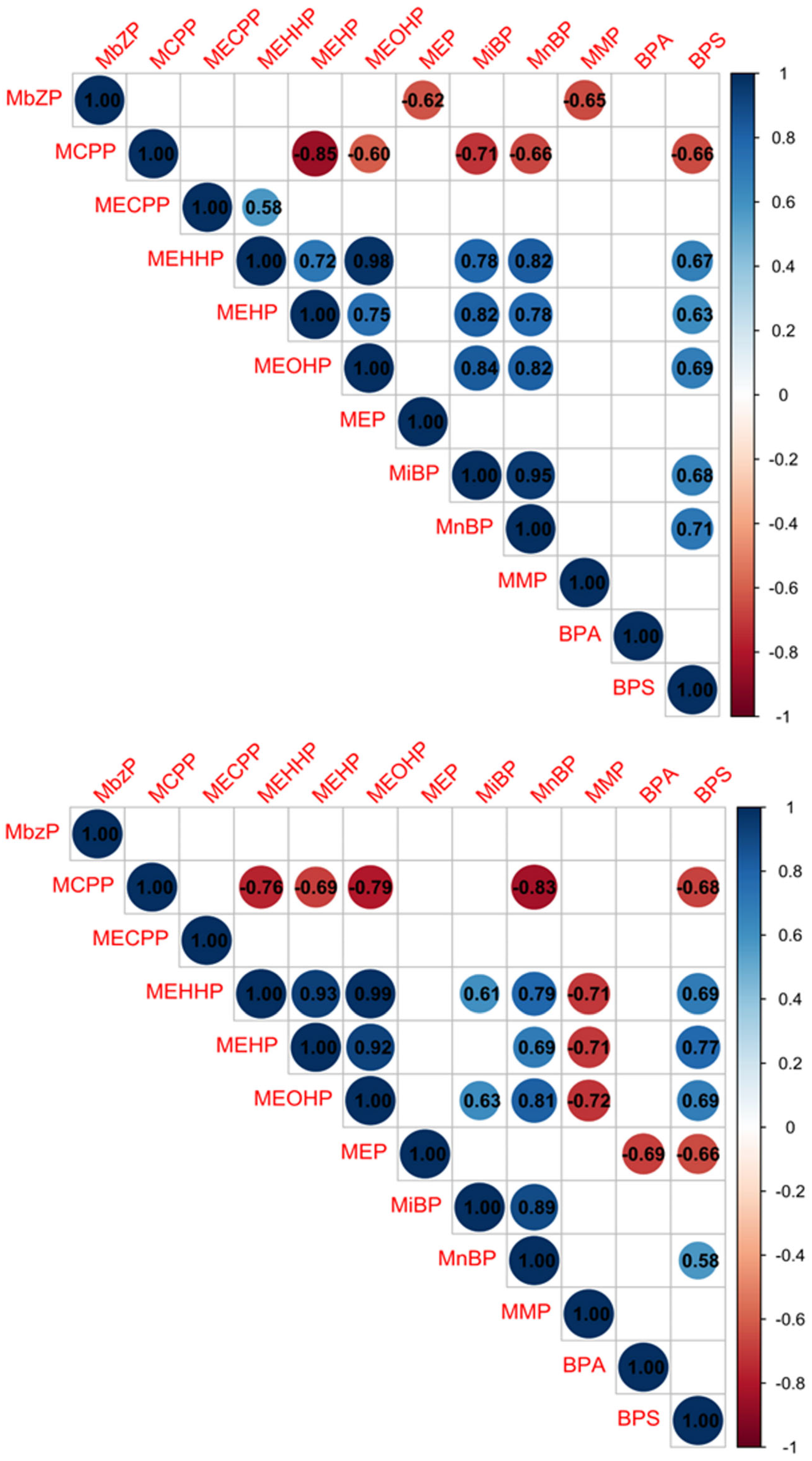 | MnBP | 0.224 | 0.04 | −0.086 | 0.43 | −0.065 | 0.54 | −0.384 | 0.002 | 0.091 | 0.49 | 0.031 | 0.82 |