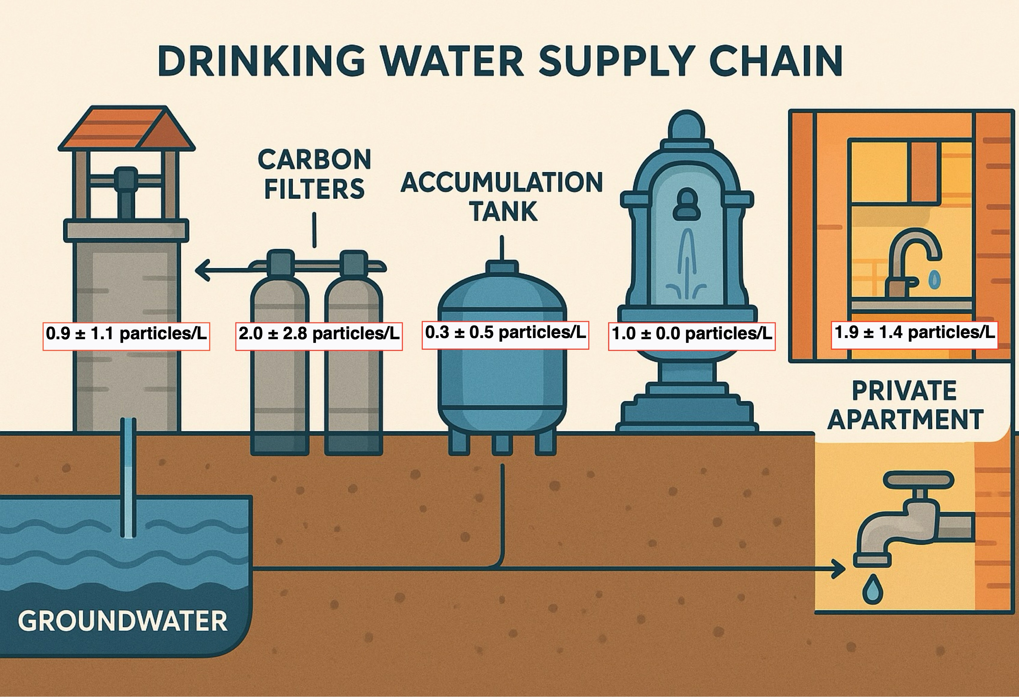 To address this knowledge gap, the present study provides a comprehensive qualitative and quantitative assessment of plastic particles along an entire drinking water supply chain serving the city of Milan (Northern Italy) to identify whether the plastic contamination at the tap derives from the groundwater source and the pumping station facilities, or whether it is mainly introduced by the distribution network and domestic piping. Samples were collected from groundwater wells, post-treatment stages (activated carbon filtration and accumulation tanks), a public drinking fountain, representing the boundary of the utility’s responsibility, and household taps within ten apartment buildings served by the same distribution network. To the best of our knowledge, this represents the first investigation to evaluate plastic particle occurrence across every stage of a complete water supply infrastructure. Therefore, our dataset could serve as a benchmark for policymakers and stakeholders to more accurately evaluate decisions regarding reference values for plastic contamination in drinking water, as well as to mitigate their presence to ensure enhanced water quality and protect public health.
