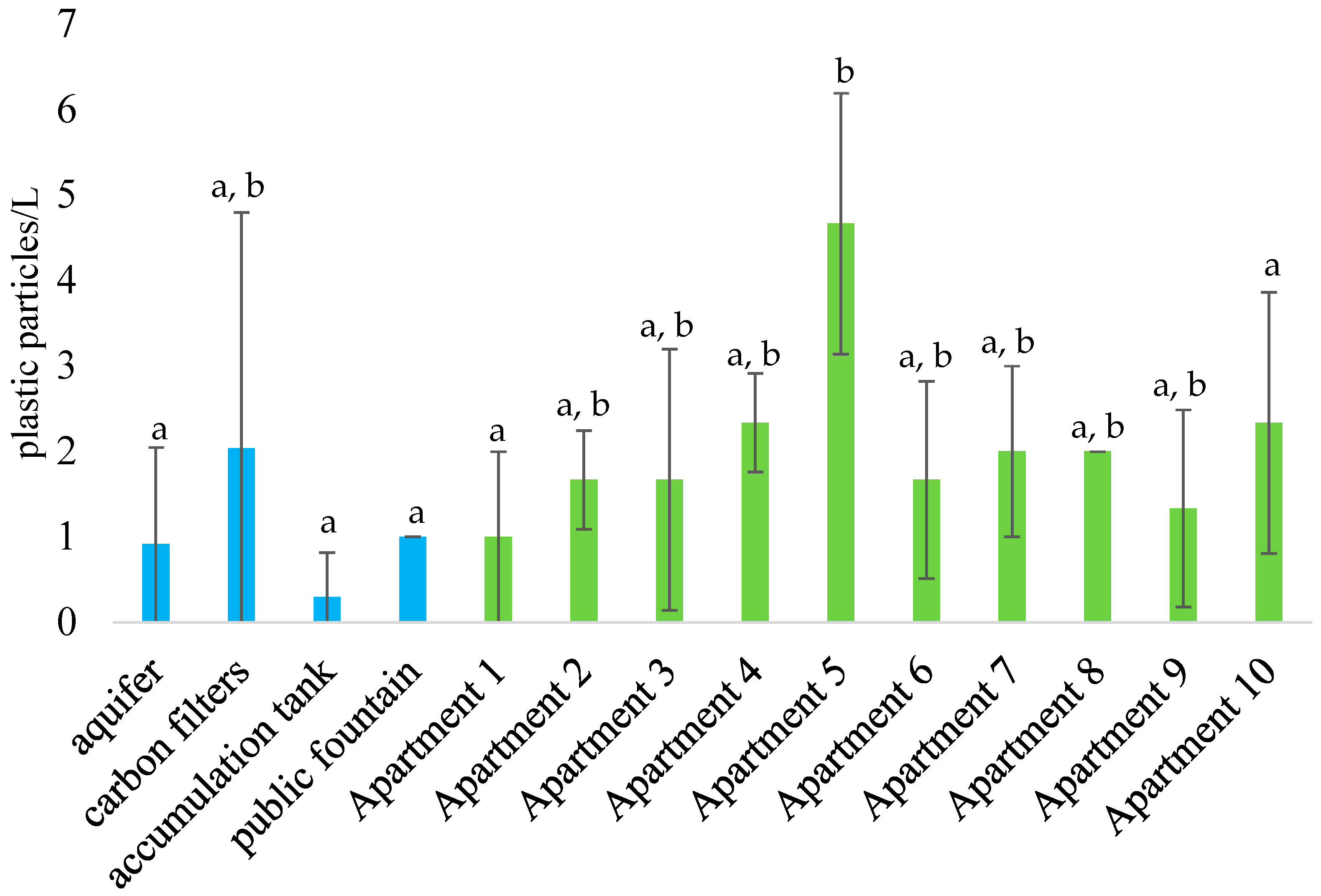 Figure 3. Mean concentration of plastic particles detected along the monitored drinking water supply chain. Sampling points under water utility management are shown in blue; those from private apartments are shown in green. Different letter points out significant differences (p < 0.05) between sampling points. Replicates for aquifer were n = 5, while for all the other sampling points, n = 3.