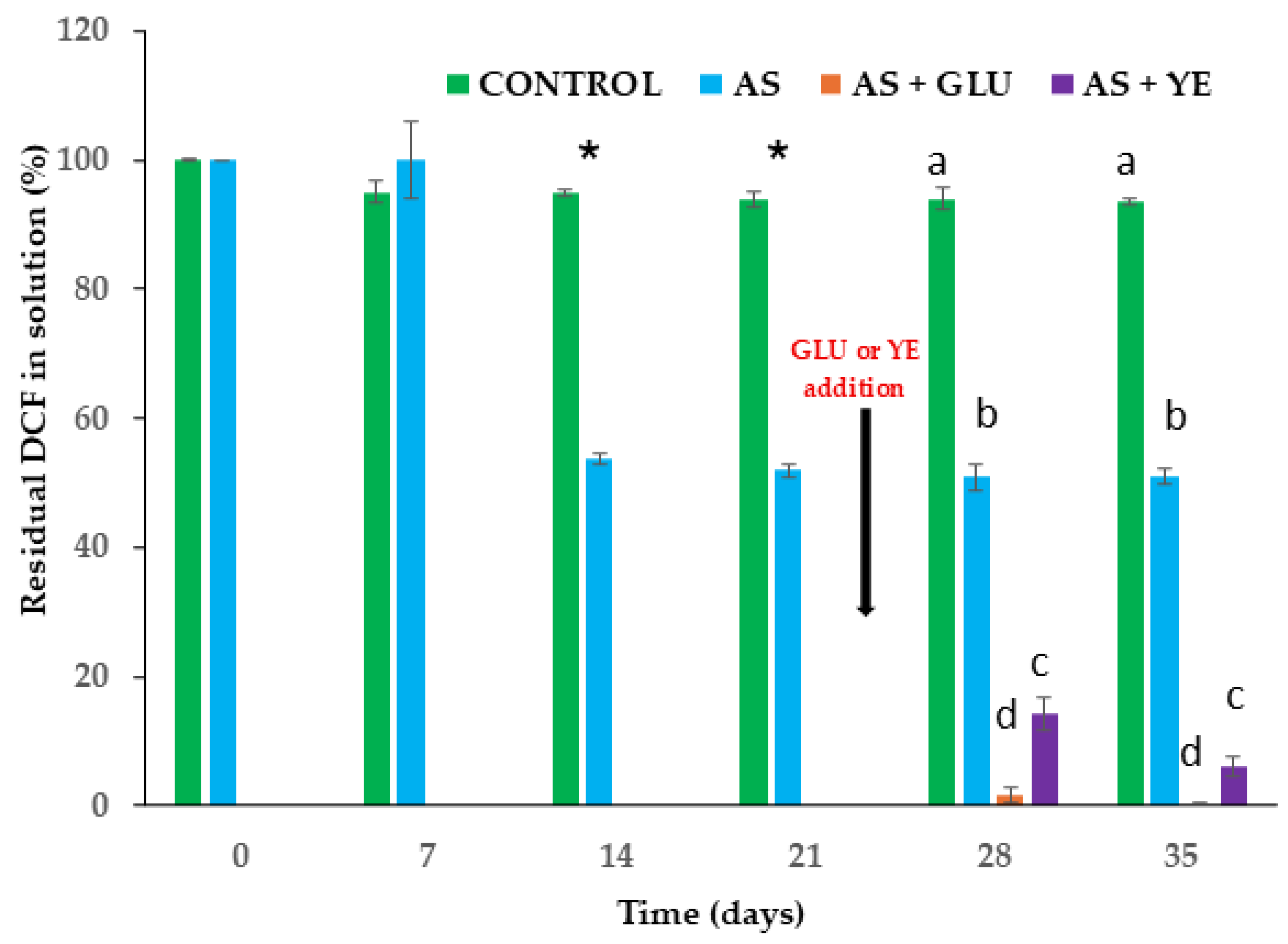 - Kraigher, B.; Mandic-Mulec, I. Influence of Diclofenac on Activated Sludge Bacterial Communities in Fed-Batch Reactors. Food Technol. Biotechnol. 2020, 58, 402–410. [Google Scholar] [CrossRef]