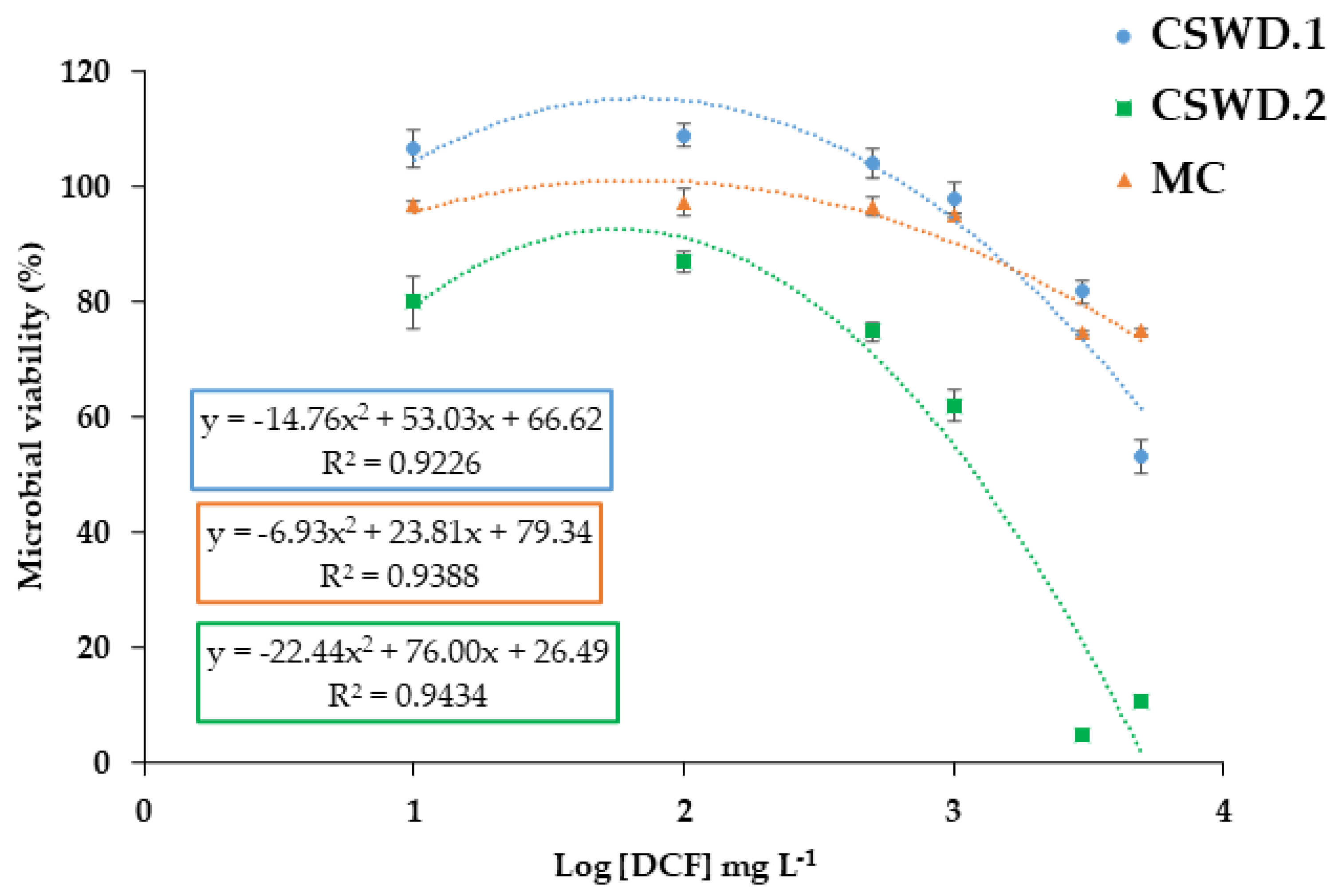 - Stylianou, K.; Hapeshi, E.; Vasquez, M.I.; Fatta-Kassinos, D.; Vyrides, I. Diclofenac Biodegradation by Newly Isolated Klebsiella sp. KSC: Microbial Intermediates and Ecotoxicological Assessment. J. Environ. Chem. Eng. 2018, 6, 3242–3248. [Google Scholar] [CrossRef]