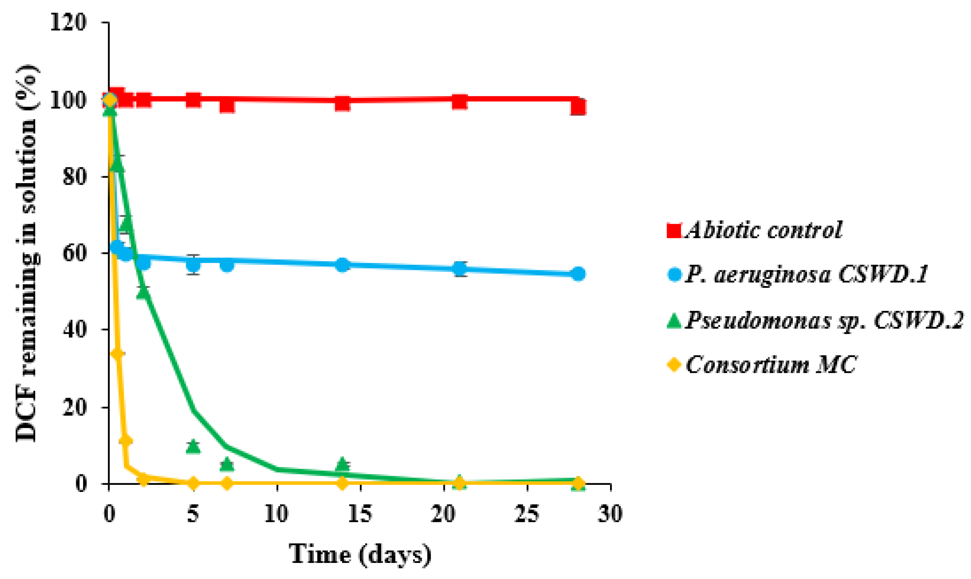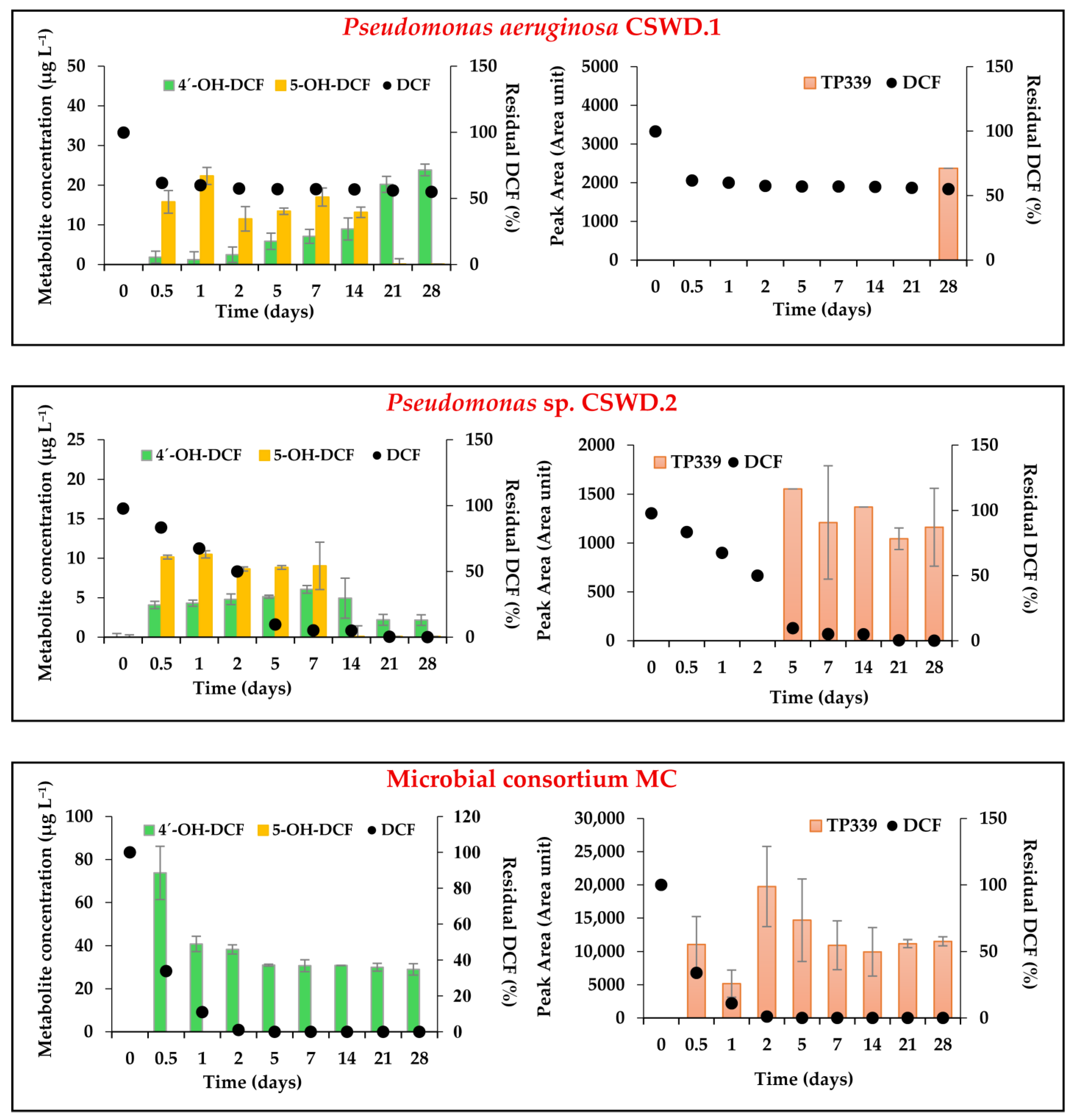 - Żur, J.; Marchlewicz, A.; Piński, A.; Guzik, U.; Wojcieszyńska, D. Degradation of diclofenac by new bacterial strains and its influence on the physiological status of cells. J. Hazard. Mater. 2021, 403, 124000. [Google Scholar] [CrossRef] [PubMed]