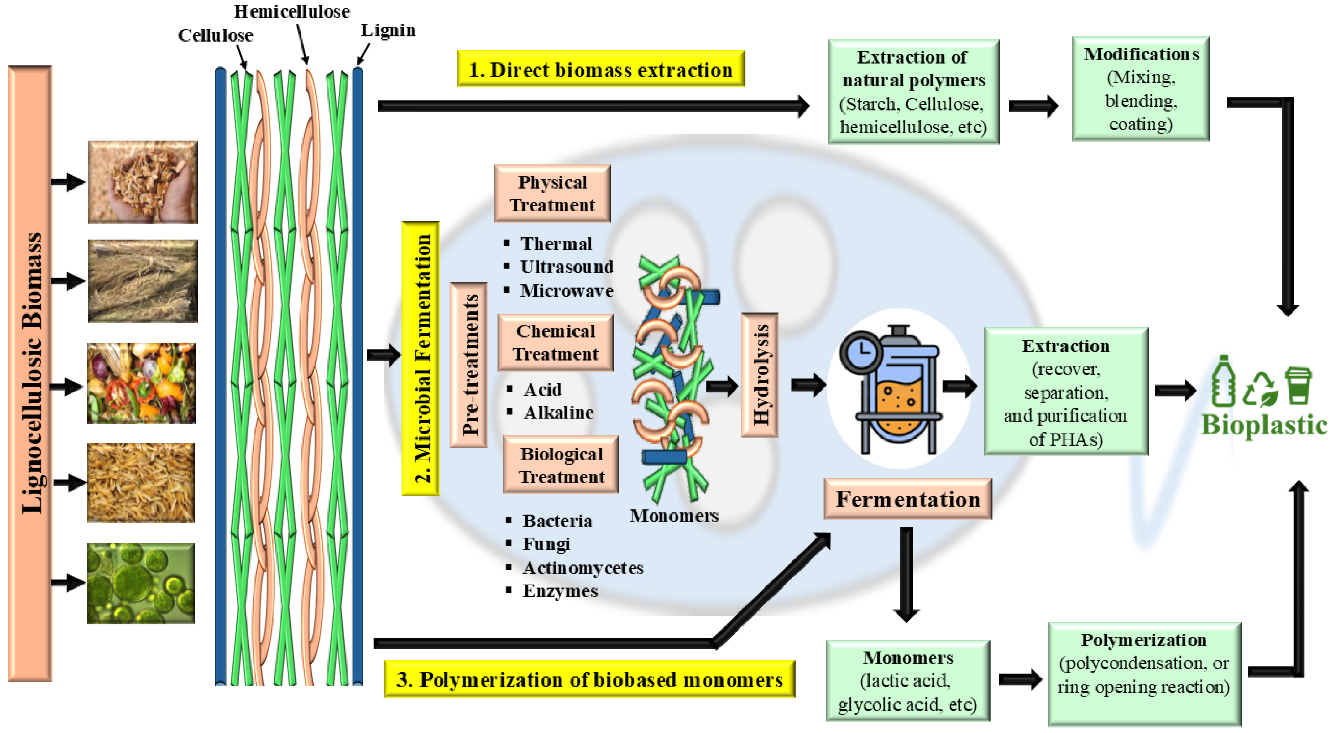 - Choudhary, P.; Pathak, A.; Kumar, P.; S, C.; Sharma, N. Commercial production of bioplastic from organic waste–derived biopolymers viz-a-viz waste treatment: A minireview. Biomass Convers. Biorefinery 2024, 14, 10817–10827. [Google Scholar] [CrossRef]