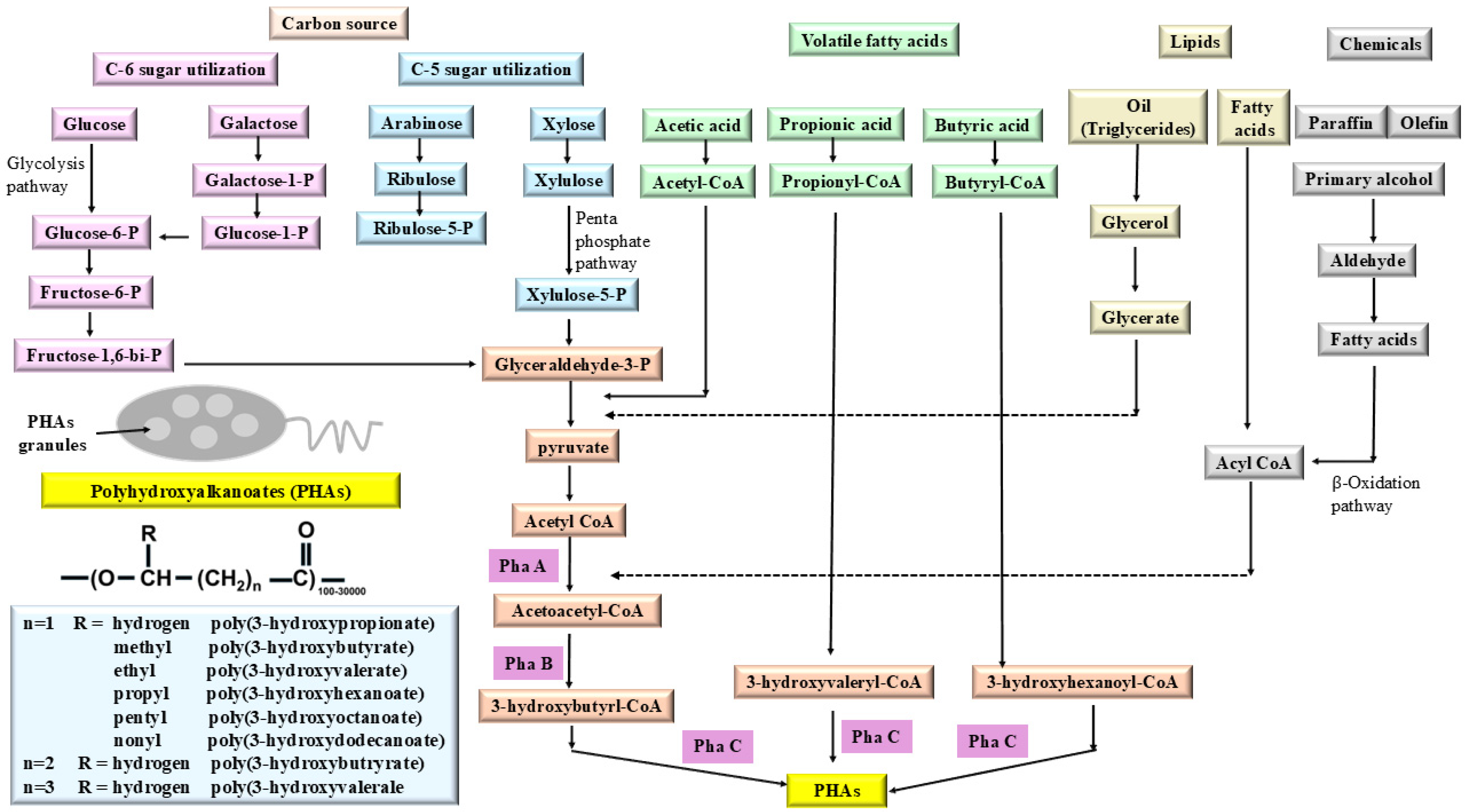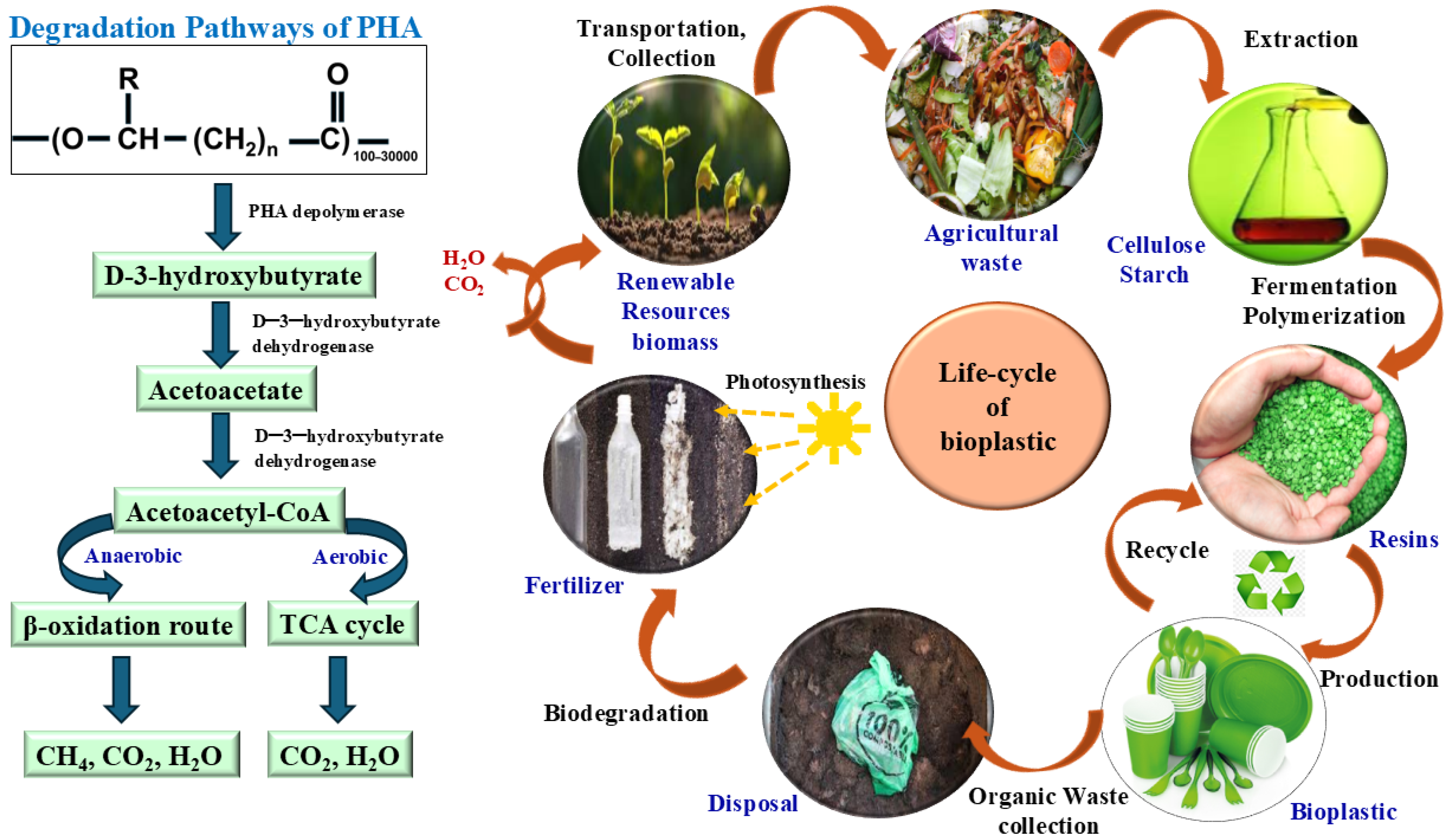- Zhou, W.; Bergsma, S.; Colpa, D.I.; Euverink, G.J.W.; Krooneman, J. Polyhydroxyalkanoates (PHAs) synthesis and degradation by microbes and applications towards a circular economy. J. Environ. Manag. 2023, 341, 118033. [Google Scholar] [CrossRef] [PubMed]