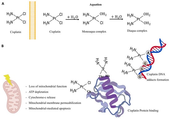 Graphic representation of cisplatin modification and functions. (A) Cisplatin acquation process. (B) Cisplatin effects on mitochondria and its binding to DNA and proteins. Thr = Thirosine, His = Histidine, Cis = Cisterine, A = Adenine, G = Guanosine. Created with BioGDP.com [34].