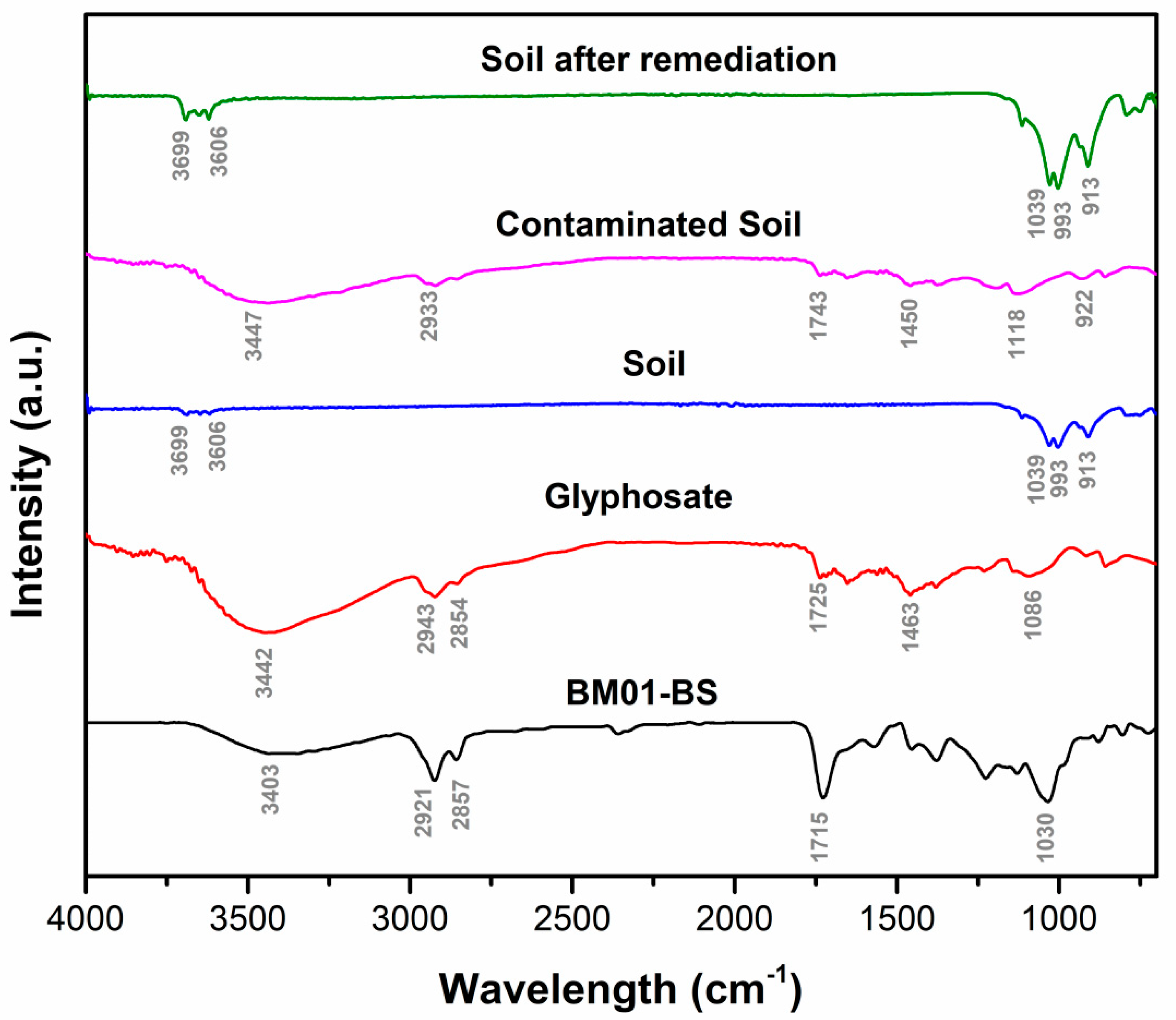 The qualitative validation of the remediation process through FTIR spectral analysis (