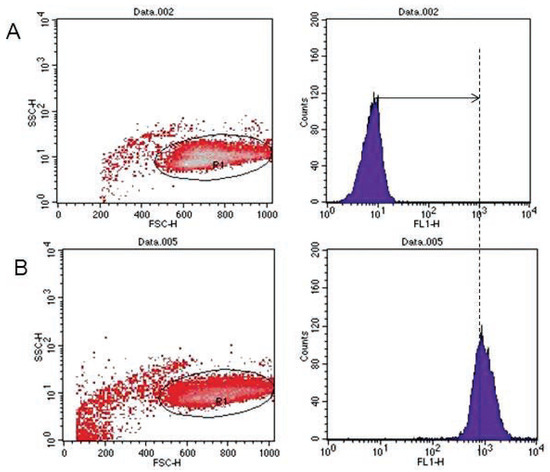Flow cytometric analysis of DiO-labeled target cells. (A) Negative control (left peak). (B) DiO positive events identified (right peak).