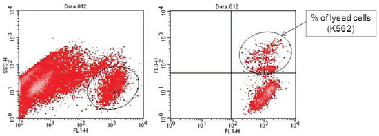 In order to evaluate the effects of PCDD/Fs on NK-like cell activity, flow cytometry was used to determine lysis of human erythroleukemic tumor cell line (K562). This method uses two fluorescent dyes to discriminate between effectors and target cells, and between live and dead target cells. DIO, green fluorescent dye, was used to label the membranes of K562, while PI (red fluorescent dye) was added during the assay when K562 membranes were disrupted by effectors. Data were acquired using a FACScalibur (Becton Dickinson, San José, USA) flow cytometer, and analyzed by the CellQuest Pro software (Becton Dickinson) to determine target cell death. A minimum of 5000 events was acquired for each sample. [32] Results were expressed as percentage of target cell (K562) lysis.