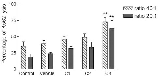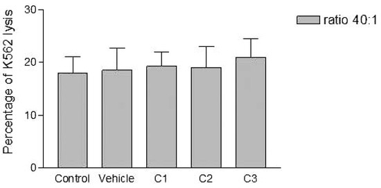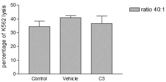 Effects of the higher concentration of PCDD/Fs mixture (C3) on the E. andrei NK-like cell activity to lyse the human tumor cells (K562). The effectors were fixed before contact with K562.
