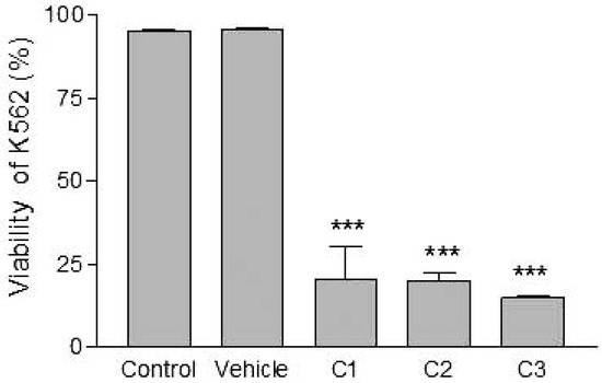 Effects of various concentrations of PCDD/Fs mixture on the human tumor cells (K562) after 3 h of in vitro exposure. Asterisks represent significant difference compared with vehicle controls (*** P<0.001).