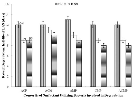 In this study, the effect of nitrogen supplementation on biodegradation of LAS by individual pure culture of LAS degrading bacteria and their consortia was examined. Nitrogen was supplied as inorganic nitrogen (NPK fertilizer) and organic nitrogen (urea). Rates of degradation of LAS by individual and consortia of bacteria were monitored as half-life (t½) which is the time it takes for microbes to break down half the amount of a chemical in water.