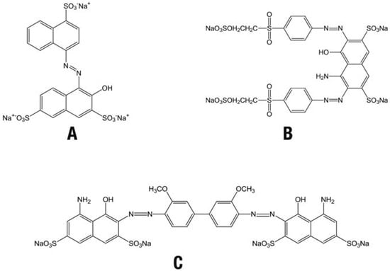 Structures of the azo dyes used in this study. A) Acid Red 27 (AR27), B) Reactive Black 5 (RB5), C) Direct Blue 15 (DB15).