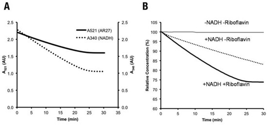 A) Reduction of AR27 by Fre and the simultaneous oxidation of nicotinamide adenine dinucleotide (NADH); B) Reduction of AR27 by Fre in the presence of NADH and/or riboflavin.