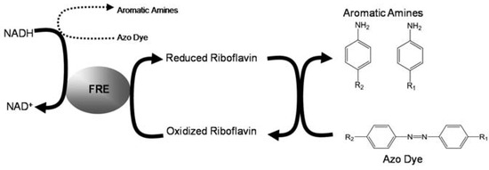 Proposed scheme depicting the reduction of an azo dye in the Fre system medi- ated by nicotinamide adenine dinucleotide (NADH) and riboflavin, reproduced (with slight modifications) from Field and Brady (2003), with permission. Dotted line indicates the non-enzymatic reduction by NADH.