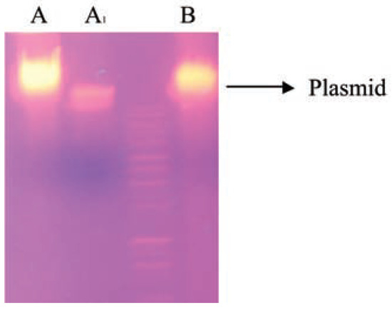 Electrophoretic separation profiles of plasmids from cured and non-cured strains. Lane A: Corynebacterium sp; Lane A1: cured Corynebacterium sp; Lane B: Burkholderia cepacia.