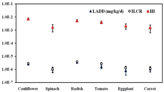 Considering the toxicological effects of HCHs and DDTs, it is important to investigate the potential exposure of human through dietary intakes. In this study, HCHs and DDTs intake through vegetables was estimated as LADD. ILCR and non-cancer health hazard [hazard quotient (HQ)] to humans was assessed using the recommended risk assessment guidance []: