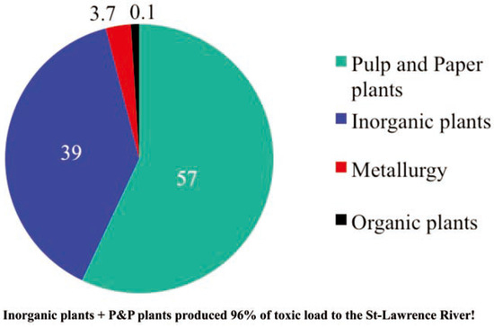 This highly covered news story led to the creation of the Saint-Lawrence Centre in 1988 and of several five-year Saint-Lawrence River Action Plans thereafter jointly funded by the governments of Canada and that of the province of Quebec to deal with water quality issues. Hence, the first Saint-Lawrence River Action Plan (SLAP) was enacted in 1988 because of deteriorated water quality in the SLR system and the major objective of the first two SLAPs (1988-1998) sought to reduce toxic impact stemming from industrial point source pollution. To identify harmful emissions to the SLR, an integrative ecotoxicological (cost- effective) tool capable of assessing the poten- tial toxicity of industrial wastes discharging to the SLR on a common comparative basis was developed known as the potential ecotoxic effects probe (PEEP) index. In brief, the PEEP index is the product of the summation of toxic units generated by several bioassays conduct- ed at different taxonomic levels and effluent flow expressed in m3/h.[9,10] For example, a Pulp and Paper effluent discharging to the Saint- Lawrence River was determined to have a toxic loading of 647,982 toxic units per m3/h emitted to the SLR, as reported in Blaise and Férard 2005.[10] The PEEP index value for this effluent, after extracting the log10 of its toxic loading, is one of 5.8. Thus, the PEEP index can also be considered to be an en ironmental Richter scale that evaluates the toxic loading of a series of industrial effluents all discharging to the same aquatic ecosystem. For the first 50 industrial plants investigated, whose effluents were discharging to the SLR and that were selected for priority toxic loading assessment on the basis of their chemical production/ emissions, PEEP index values were shown to vary from 0 (no toxic loading) to 7.8 (very high toxic loading). Application of the PEEP index clearly identified categories of effluents responsible for marked toxic loading to the SLR which then allowed enlightened decision- making to proceed with corrective action (clean up) on (classes of) effluents identified as the most potentially harmful to the SLR receiving aquatic ecosystem. Figure 1 illus- trates the culprit effluents, in terms of high toxic loading to the SLR, as coming from the Pulp and Paper and Inorganic plant industries.