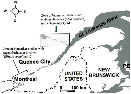 - Gagné, F.; Blaise, C.; Pellerin, J.; Fournier, M. Etudes de biomarqueurs chez la mye com-mune (Mya arenaria) du fjord du Saguenay: bilan de recherches (1997 à 2006)/Biomarker studies of the soft-shell clam (Mya arenaria) in the Saguenay Fjord: research results (1997-2006). Rev Sci Eau 2009, 22, 253–259. [Google Scholar]