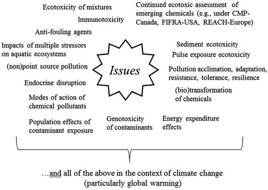 At the dawn of the 21st century, ecotoxicolo- gy continues to be confronted with diverse issues, most of which are essentially linked to lingering problems that are difficult to elimi- nate or deal with. As intimated previously, con- tinuous technology, creation of new molecules, as well as an ever- increasing human popula- tion, all place growing demands on (non)renewable resources of the planet that exacerbate impacts on ecosystems. While cer- tainly non exhaustive, Figure 3 lists some issues of importance that continue to require attention by scientists and decision-makers. On a more contemporary note, we can expect ecotoxiciy to be even more challenging to mas- ter and resolve in the context of climate change. With global warming, for example, more intense effects of contaminants are like- ly possible owing to heat-metabolization inter- actions and decreases in water quantity, as well as increases in water hypoxia conditions, toxic algal blooms and altered geographical distribution of xenobiotics. Additionally, the cumulative effects of chemical and biological stressors, coupled with climate change, are of concern. Invasive parasites and pathogens, for example, are purported to interact with anthro- pogenic stressors to reduce animal health in biota or even to increase mortality events in some situations. Such combined effects could thus reduce resistance or tolerance to infec- tion with possible population impacts.[20] Again, increases in numbers of invasive species linked to global warming are showing that some native predators are shifting their diet toward invasive prey. Such diet shifts may have important parasitological and immuno- logical consequences that could ultimately affect predator fitness via changes in condition and contaminant exposure. Exploring links between invasive prey and parasitism, contam- inants and fitness of their native predators thus merit future attention.[66] Finally, global warming may produce other potential smoking guns via increased release of toxic compounds formed in ice via photo-chemical processes upon melting, thereby adding additional con- taminant pressures on wildlife.[67]