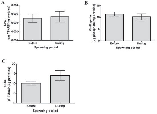 Analysis of (A) lipid peroxidation (LPO), (B) vitellogenin-like proteins and (C) in gonads of mussels before and during spawning period. No significant differences are observed. COX, cyclooxygenase.