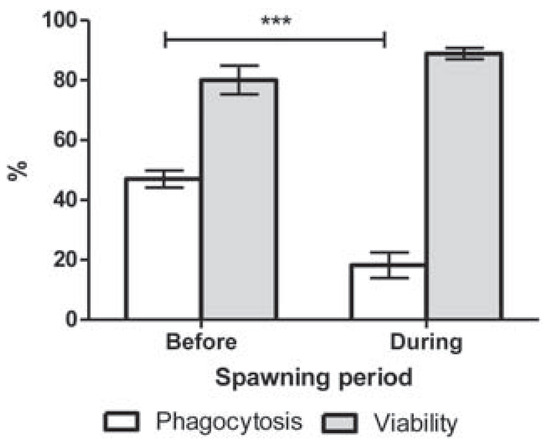 Phagocytic capacity and viability of hemocytes from Mytilus edulis before and during spawning period. ***P<0.0001.